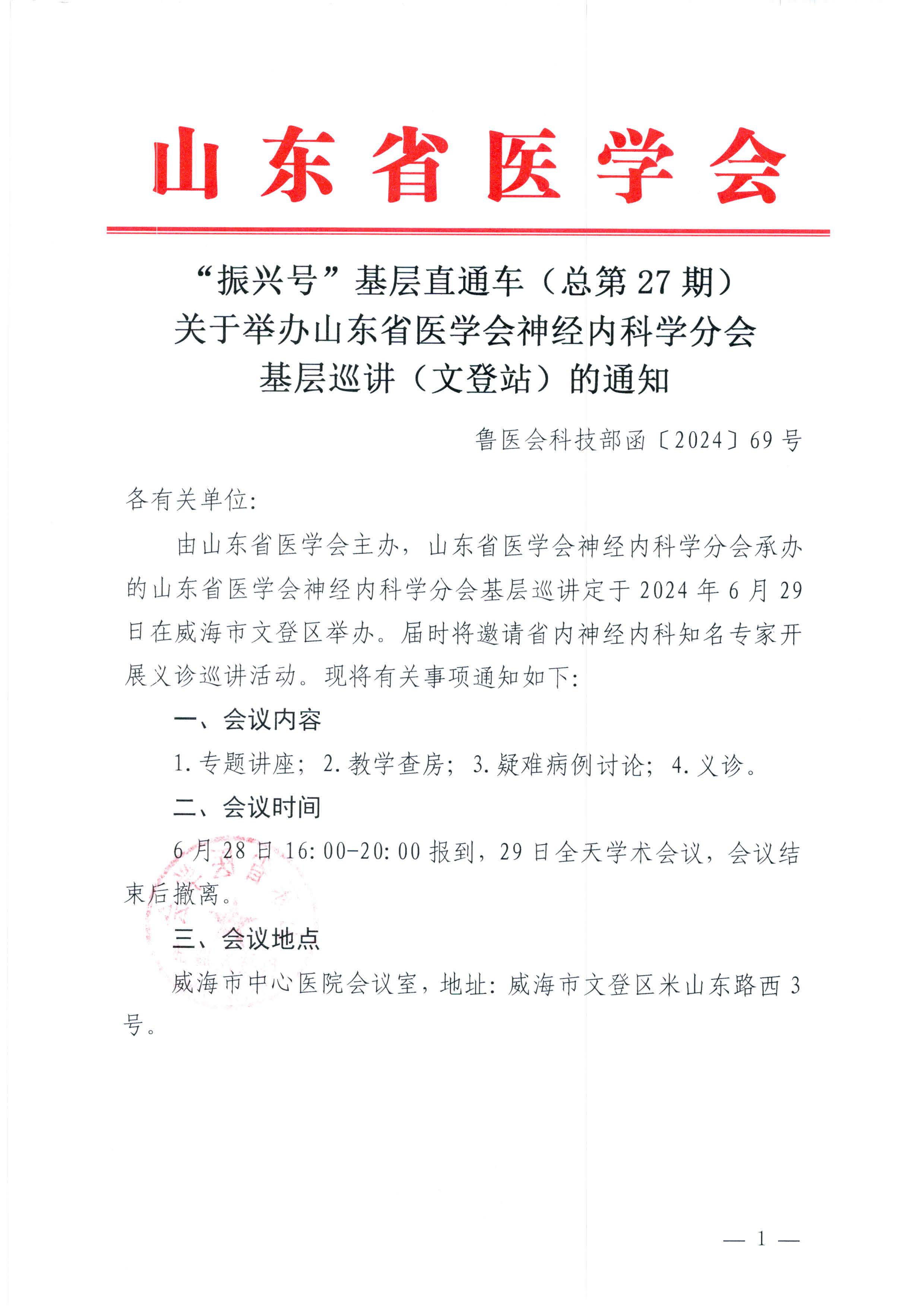 “振兴号”基层直通车(总第27期)关于举办山东省医学会神经内科学分会基层巡讲(文登站)的通知