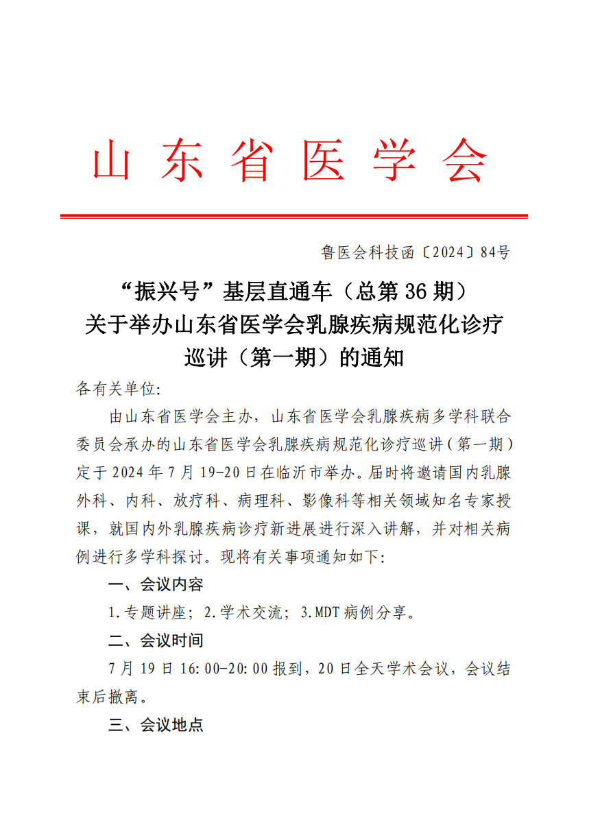 “振兴号”基层直通车(总第36期) 关于举办山东省医学会乳腺疾病规范诊疗巡讲(第一期)的通知