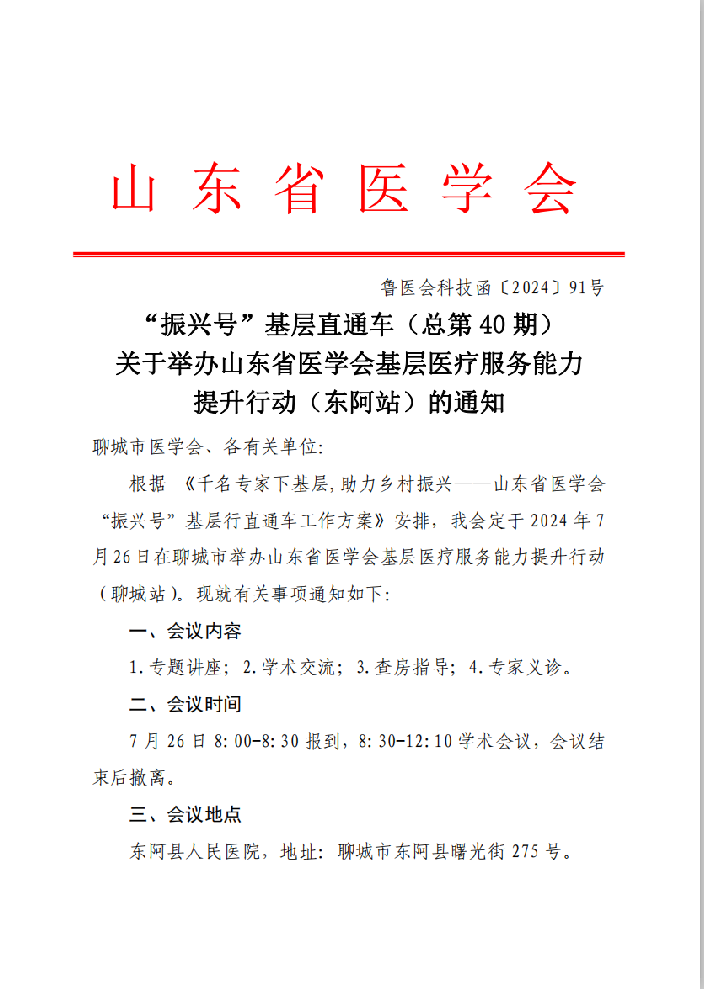 “振兴号”基层直通车(总第40期) 关于举办山东省医学会基层医疗服务能力提升行动(东阿站)的通知