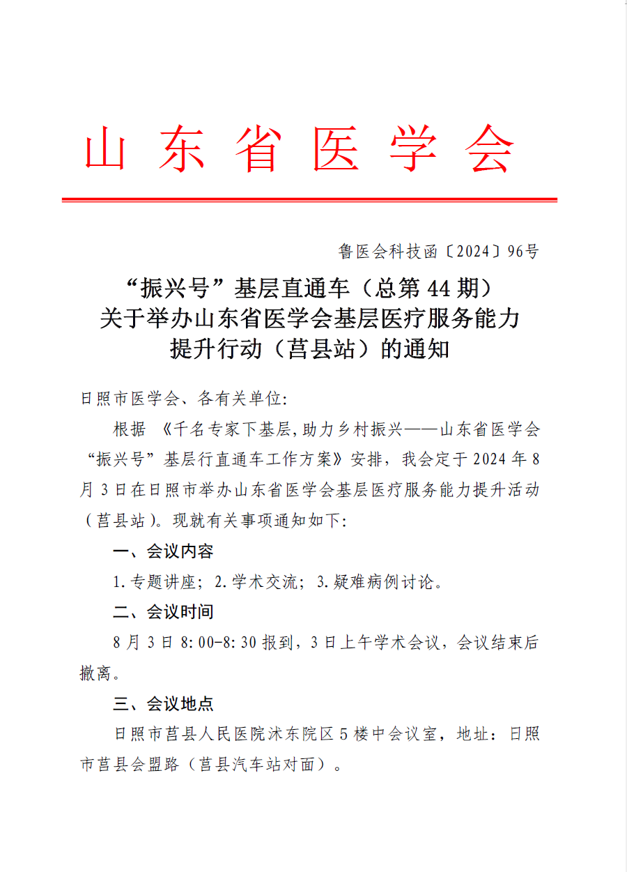 "振兴号"基层直通车(总第44期)关于举办山东省医学会基层医疗服务能力提升行动(莒县站)的通知
