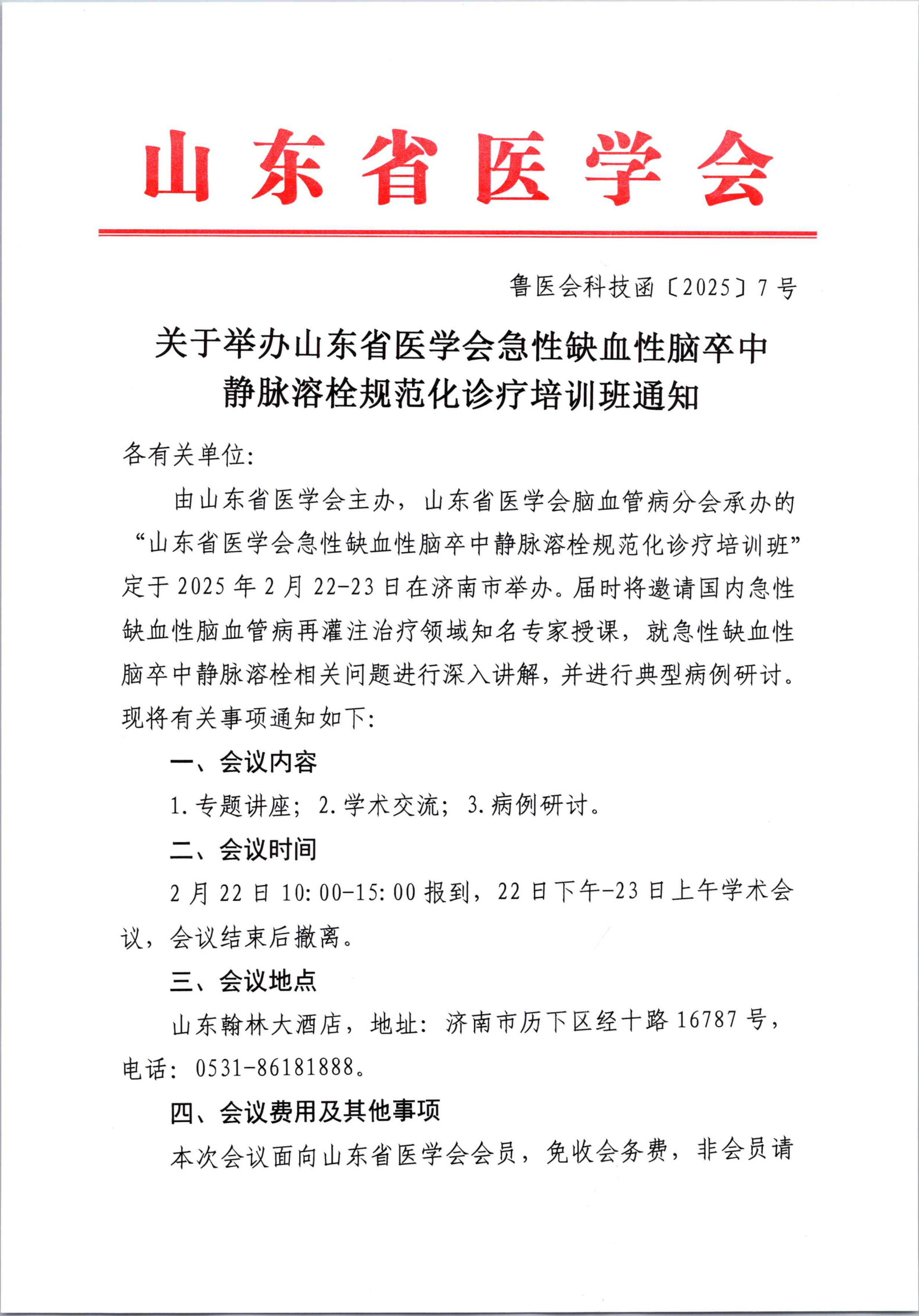 关于举办山东省医学会急性缺血性脑卒中静脉溶栓规范化诊疗培训的通知