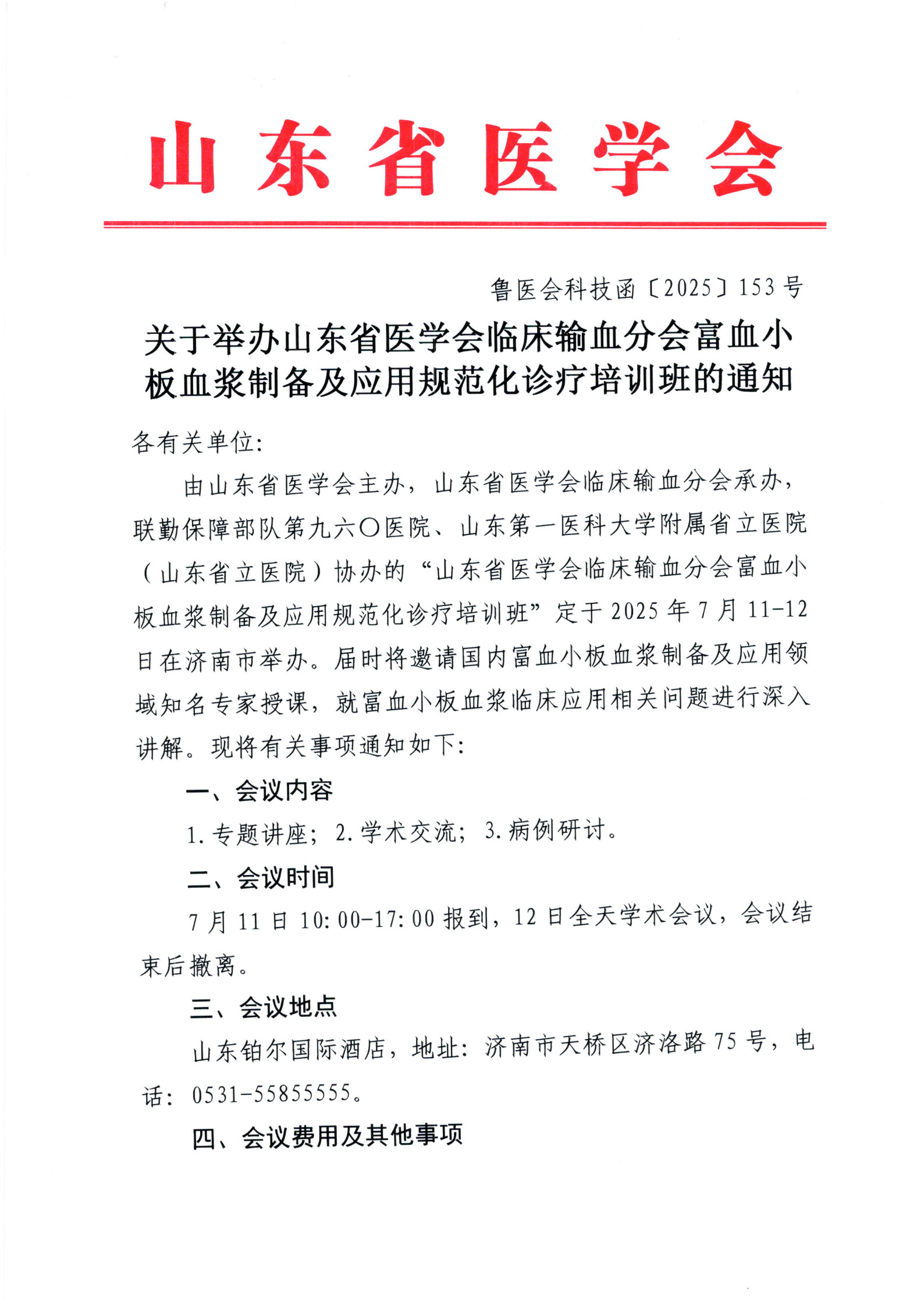 关于举办山东省医学会临床输血分会富血小板血浆制备及应用规范化诊疗培训班的通知