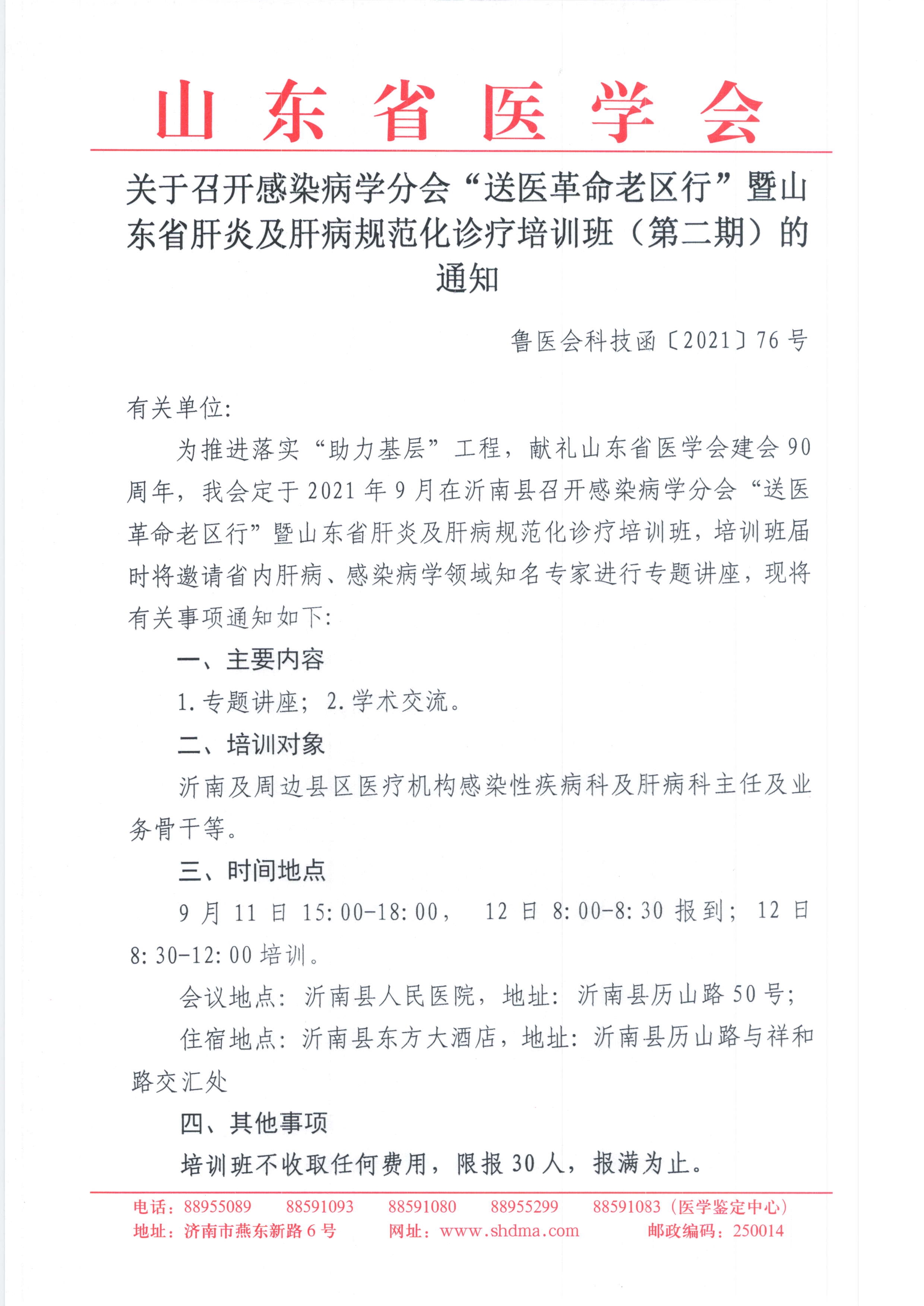 关于召开感染病学分会“送医革命老区行”暨山东省肝炎及肝病规范化诊疗培训班(第二期)的通知