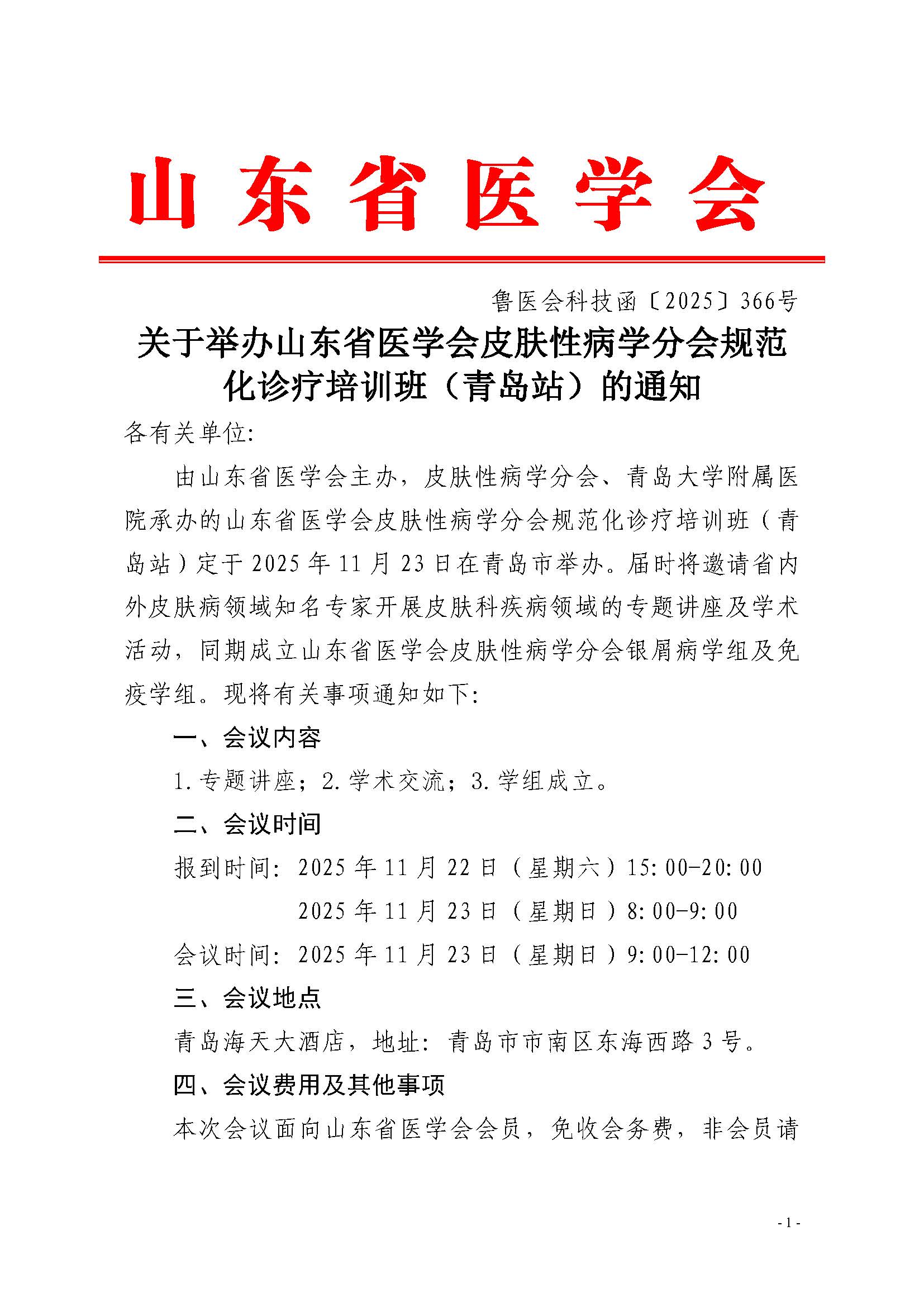 关于举办山东省医学会皮肤性病学分会规范化诊疗培训班(青岛站)的通知