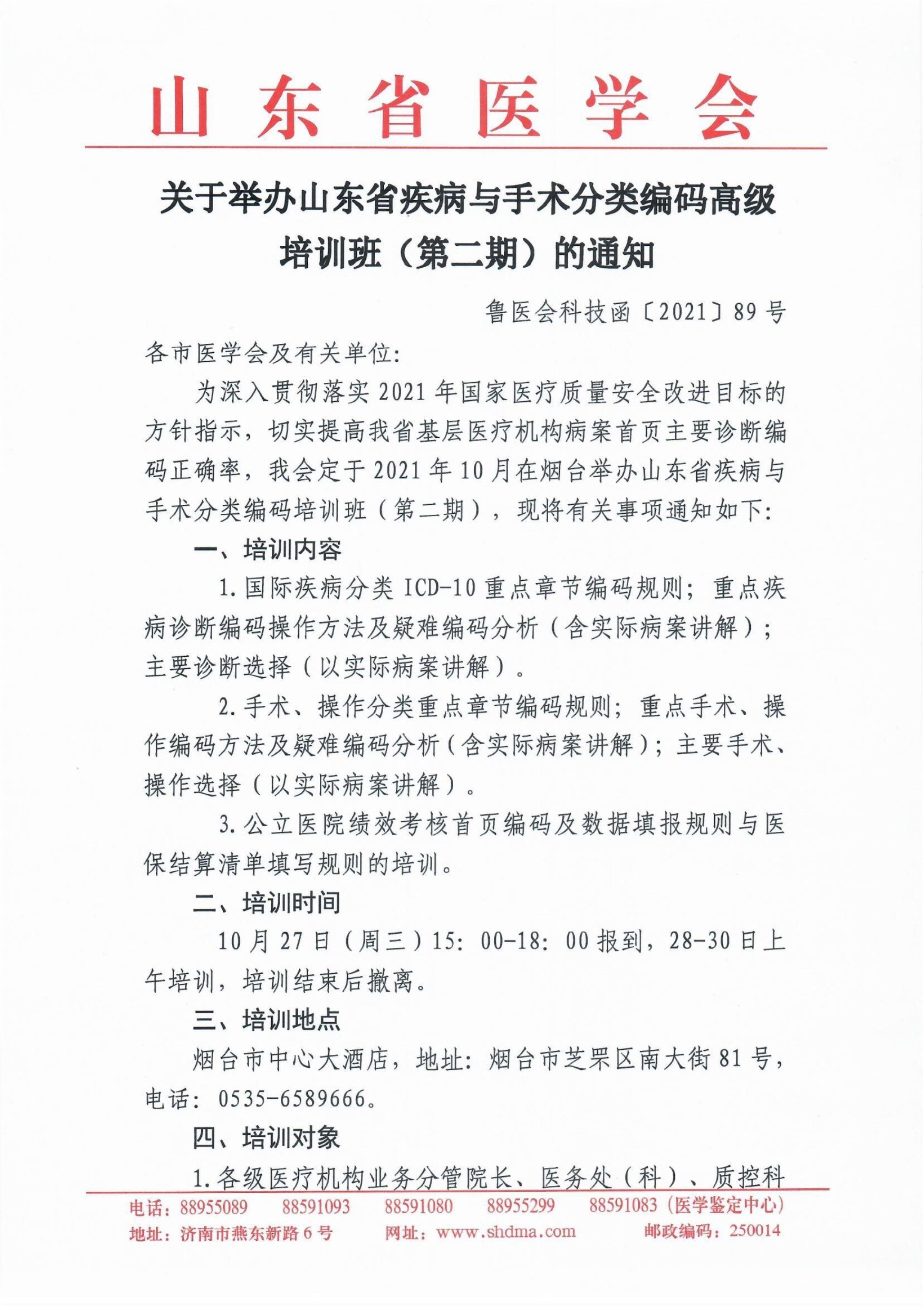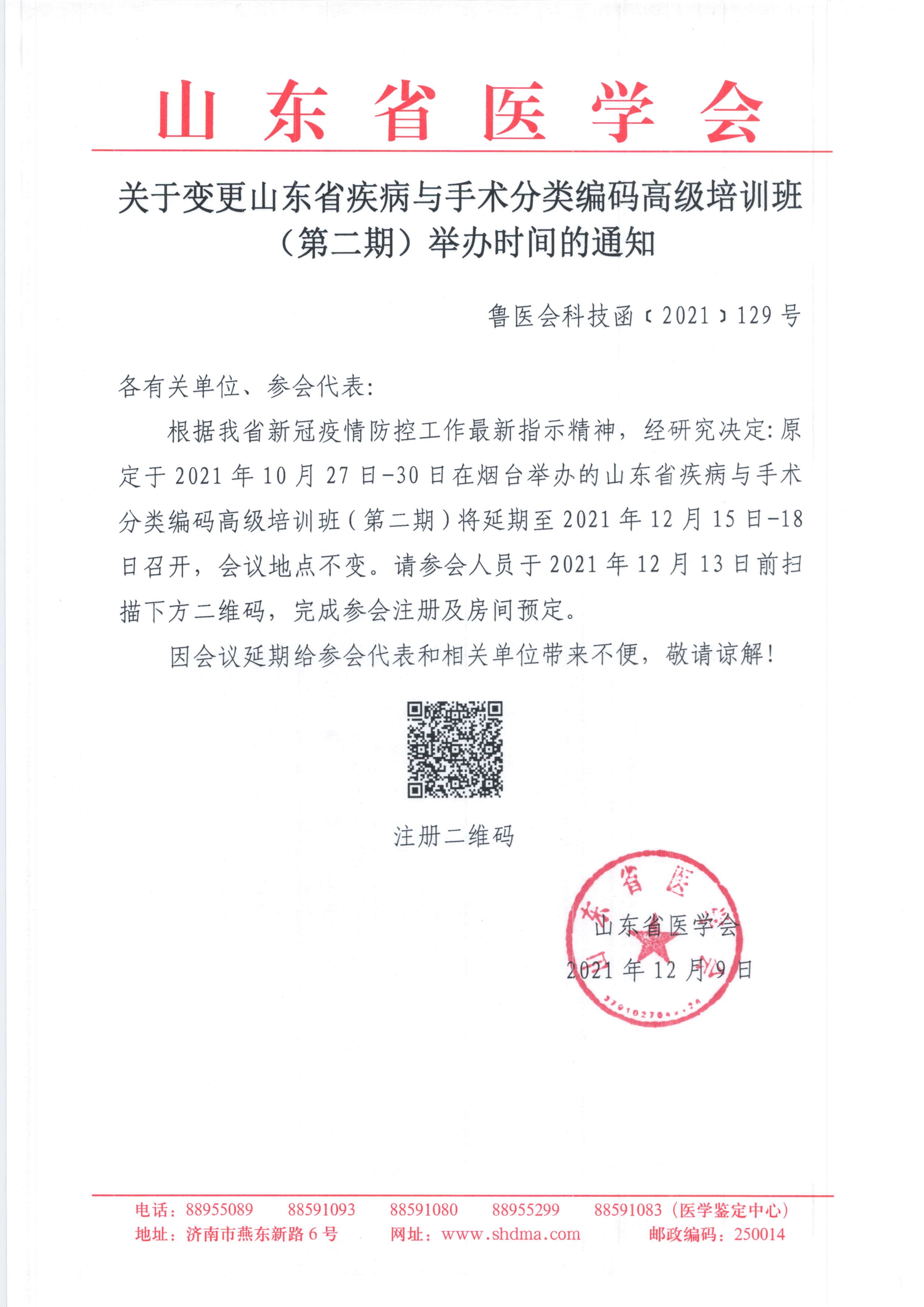 关于变更山东省疾病与手术分类编码高级培训班(第二期)举办时间的通知