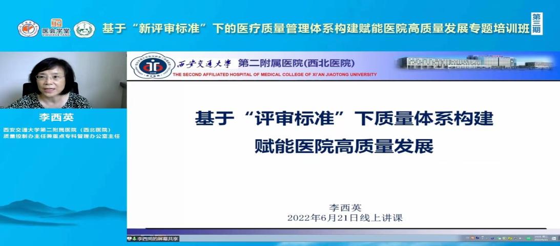 6月21日,由山东省医学会主办的医会学堂——“基于“新评审标准”下的医疗质量体系构建赋能医院高质量发展专题培训班(第三期)通过线上直播形式如期召开。本次培训班邀请国家卫生健康委医院管理研究所特聘专家、医疗质量管理专家智库专家李西英作专题讲座。