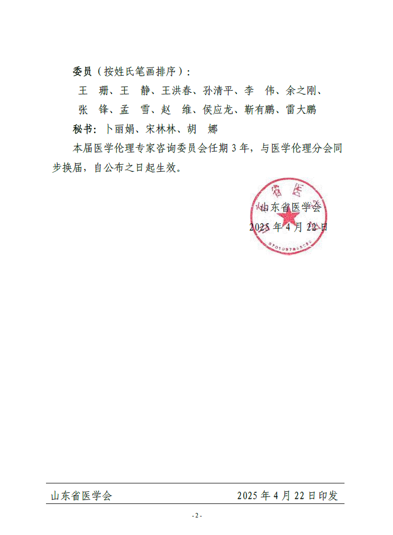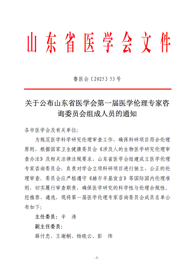 关于公布山东省医学会第一届医学伦理专家咨询委员会组成人员的通知