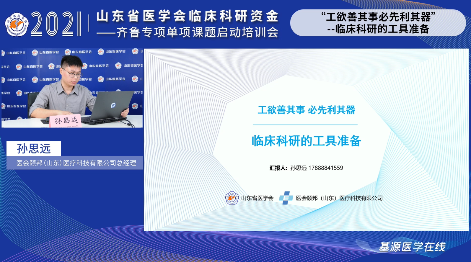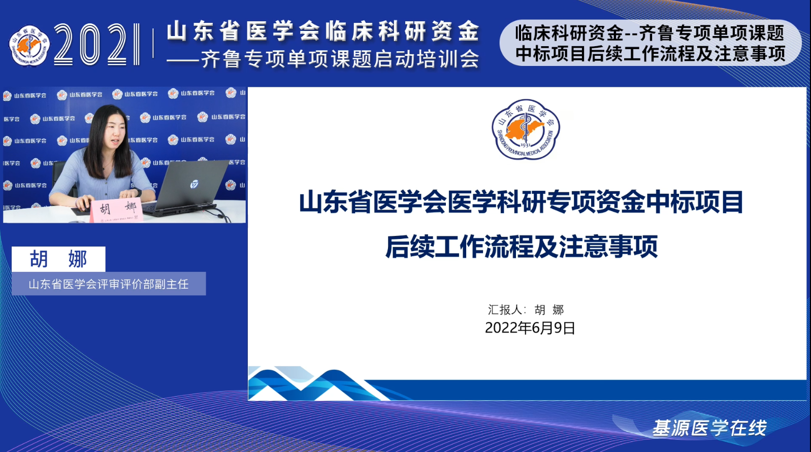 6月9日下午,山东省医学会临床科研资金-齐鲁专项单项课题启动培训会通过线上顺利召开。省医学会副秘书长岳冬丽,齐鲁制药销售总公司副总经理赵世彩出席会议并致辞,省医学会科研管理分会主任委员、山东大学齐鲁医院教育处处长吕明,山东省立医院新生儿科副主任于永慧,医会颐邦(山东)医疗科技有限公司总经理孙思远,山东省医学会评审评价部副主任胡娜进行专题授课,岳冬丽主持会议,199项中标项目负责人及项目组主要成员线上参会。