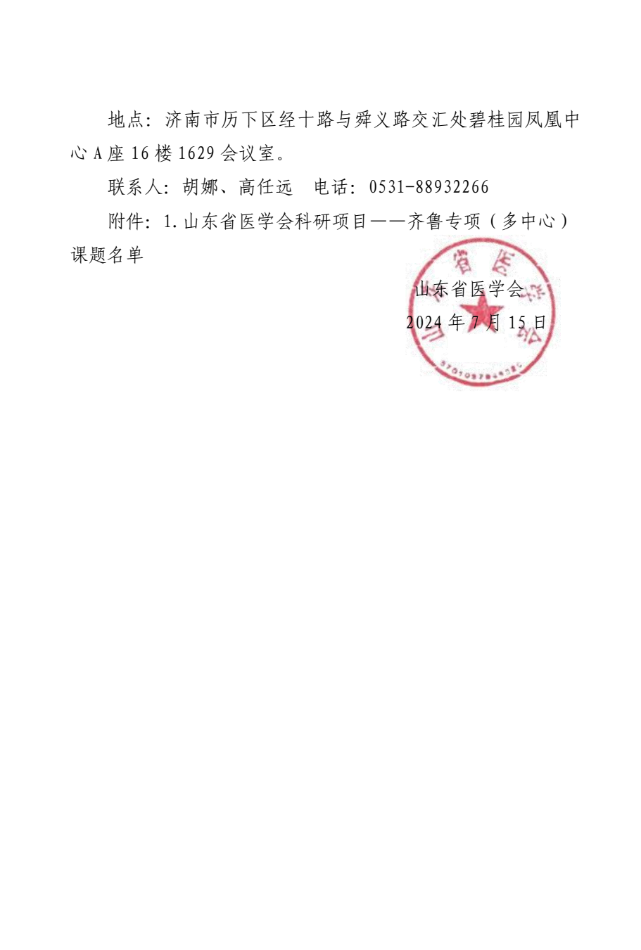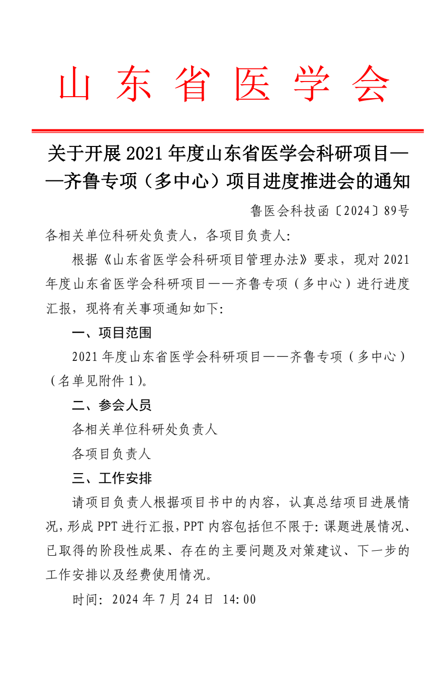 关于开展2021年度山东省医学会科研项目——齐鲁专项(多中心)项目进度推进会的通知