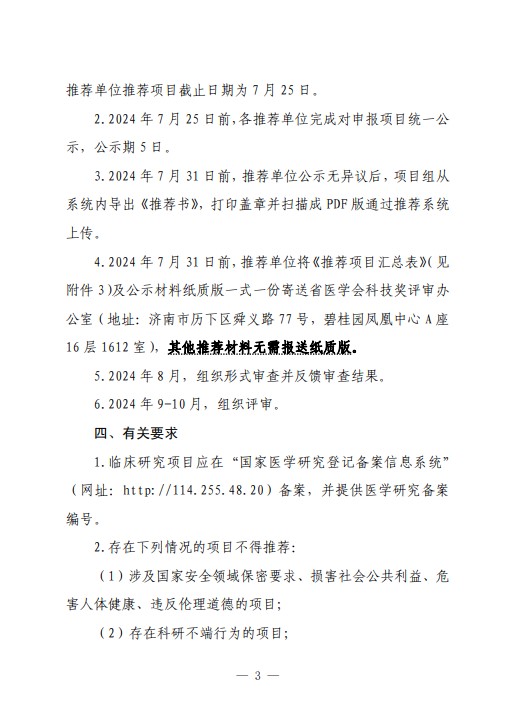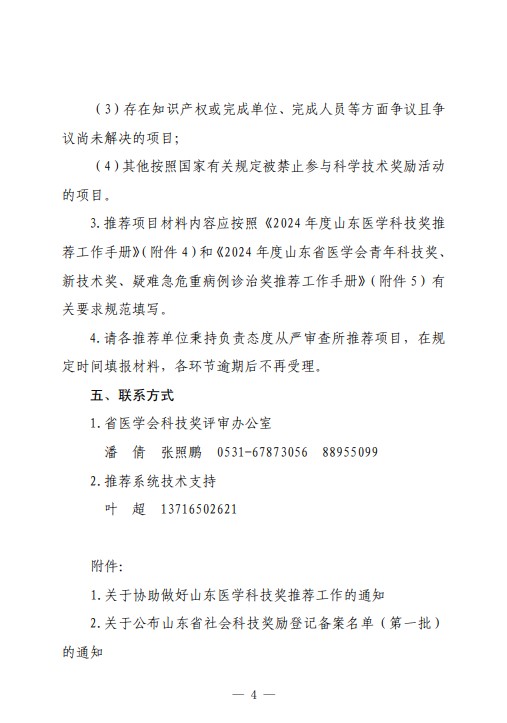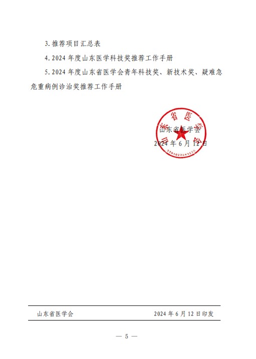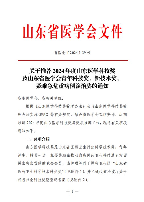 关于推荐2024年度山东医学科技奖及山东省医学会青年科技奖、新技术奖、疑难急危重病例诊治奖的通知
