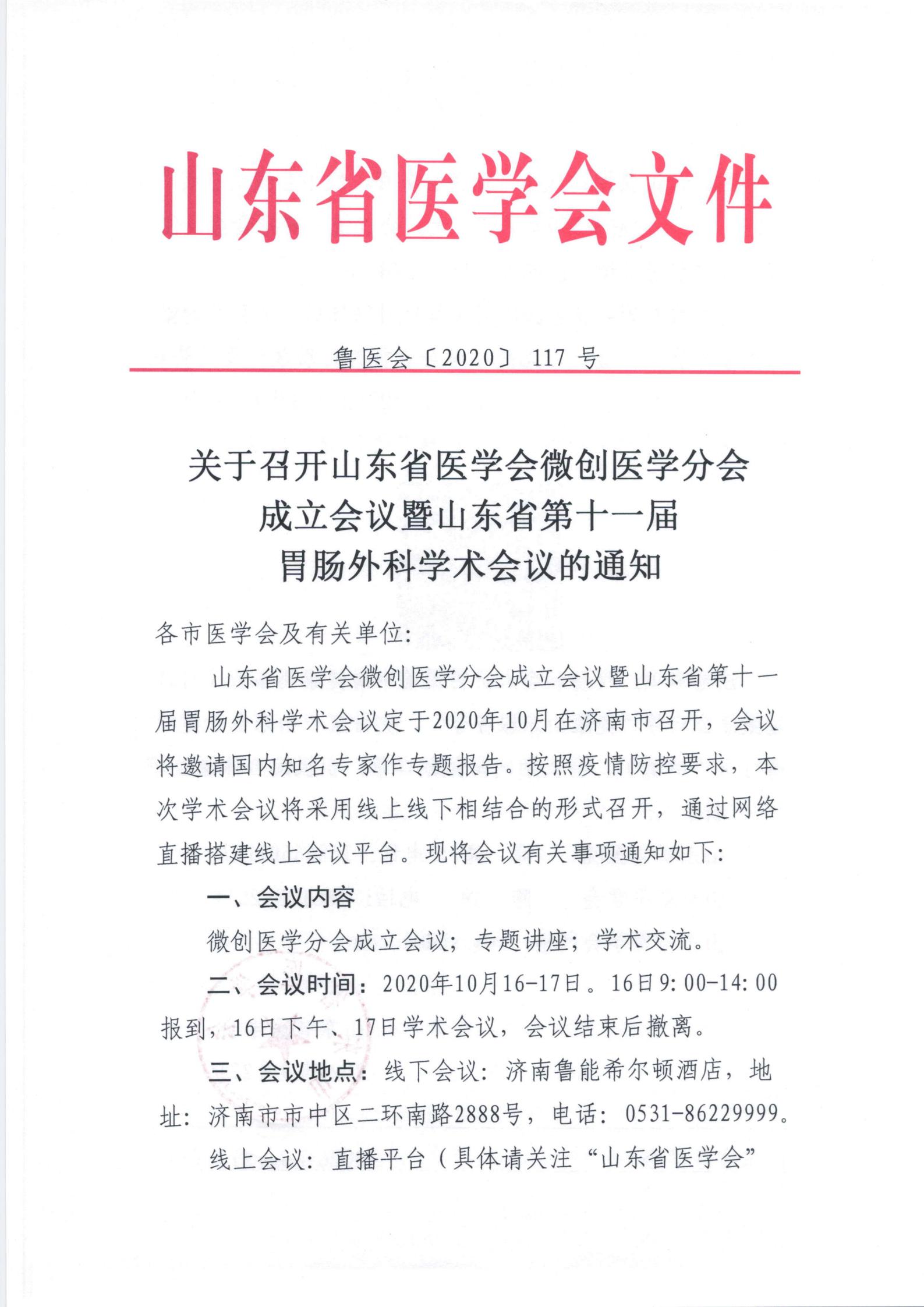 关于召开山东省医学会微创医学分会成立会议暨山东省第十一届胃肠外科学术会议的通知