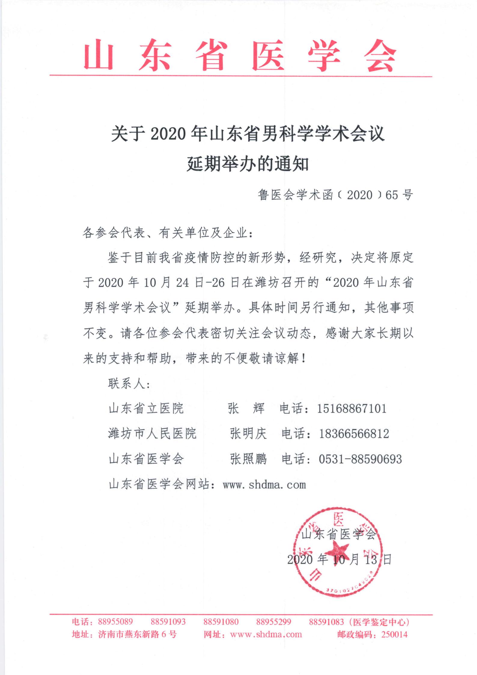 关于2020年山东省男科学学术会议延期举办的通知