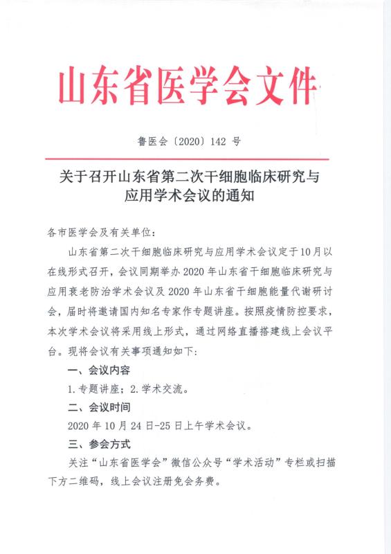 关于召开山东省第二次干细胞临床研究与应用学术会议的通知