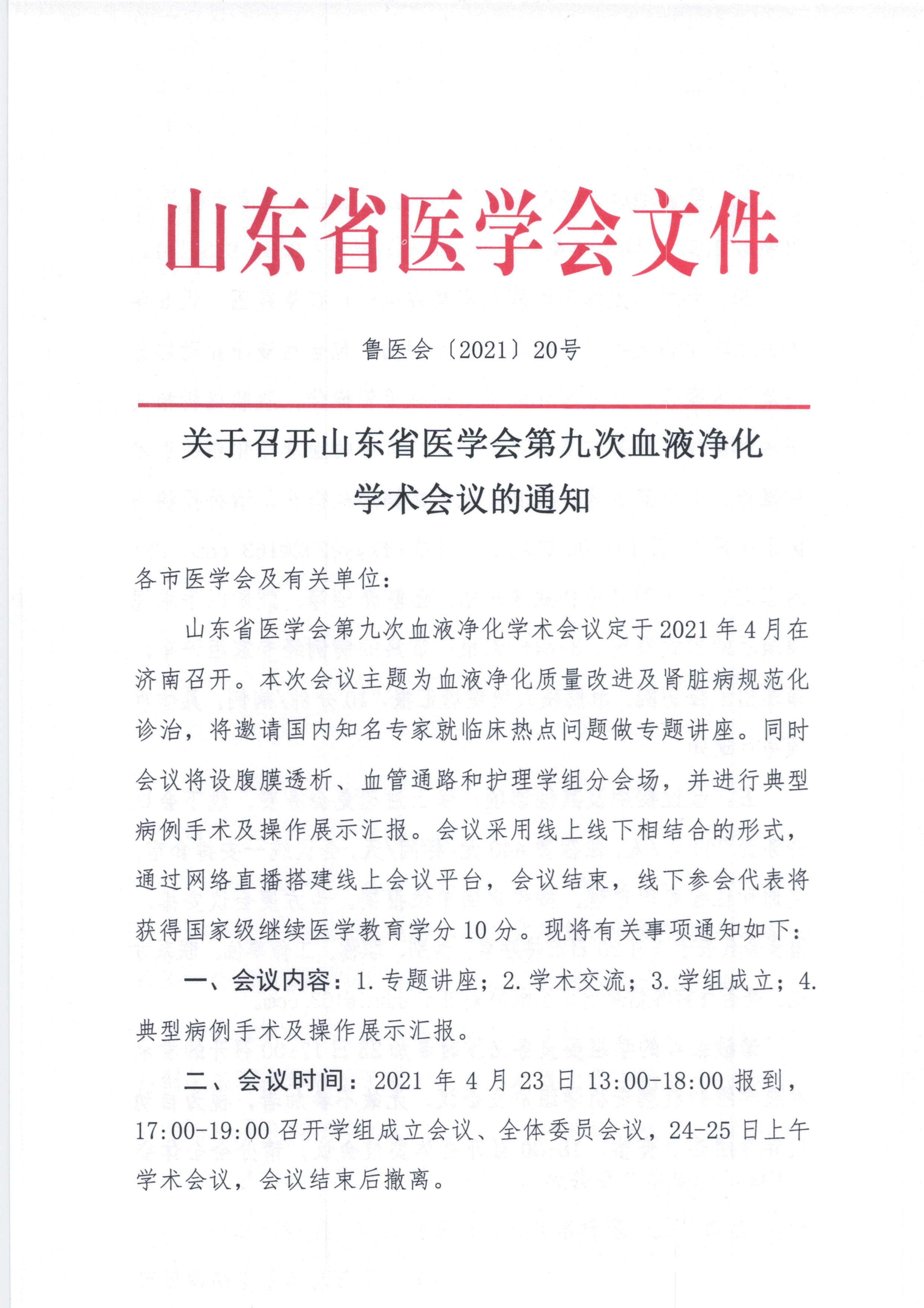 关于召开山东省医学会第九次血液净化学术会议的通知