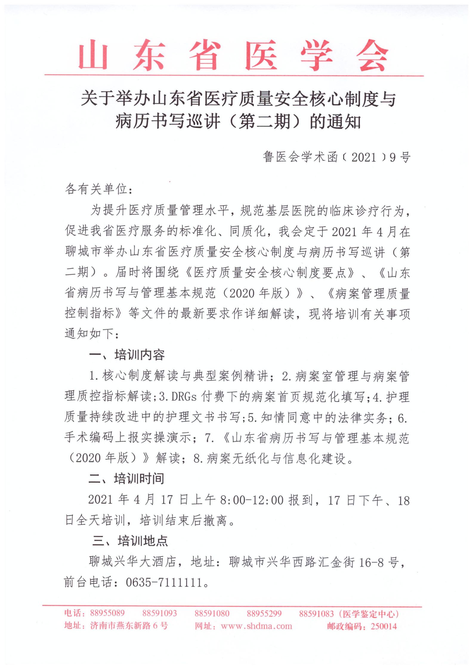 关于举办山东省医疗质量安全核心制度与病历书写巡讲(第二期)的通知