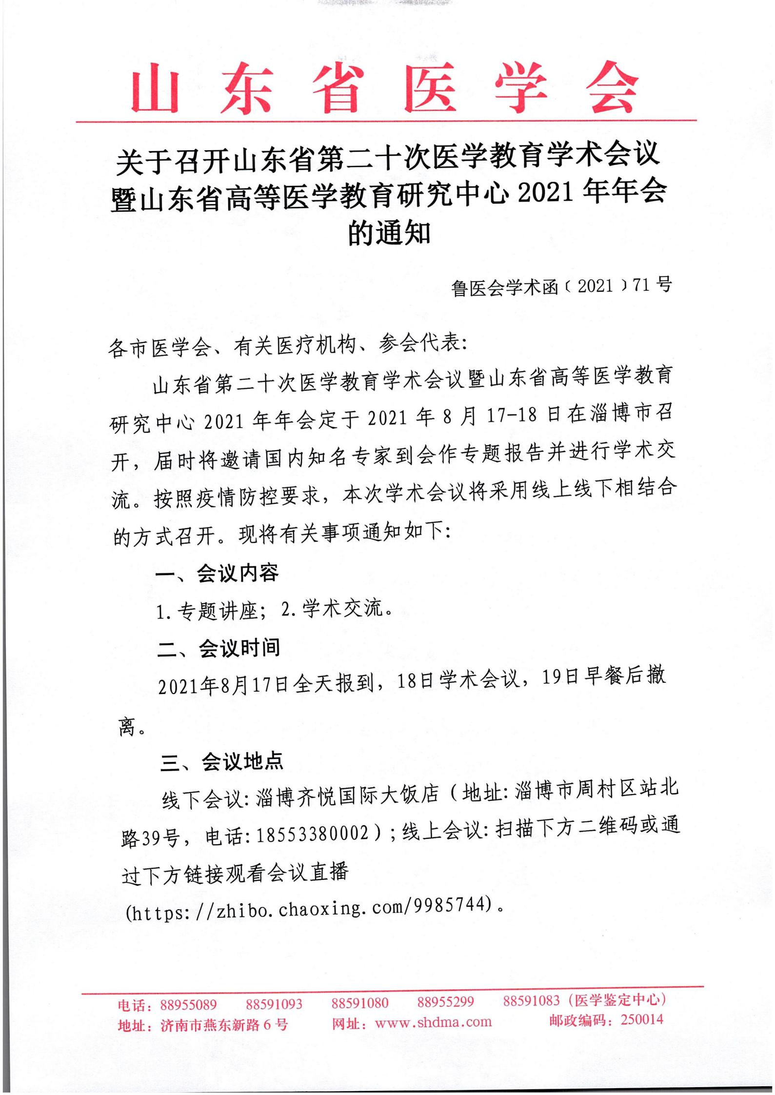 关于召开山东省第二十次医学教育学术会议暨山东省高等医学教育研究中心2021年年会的通知