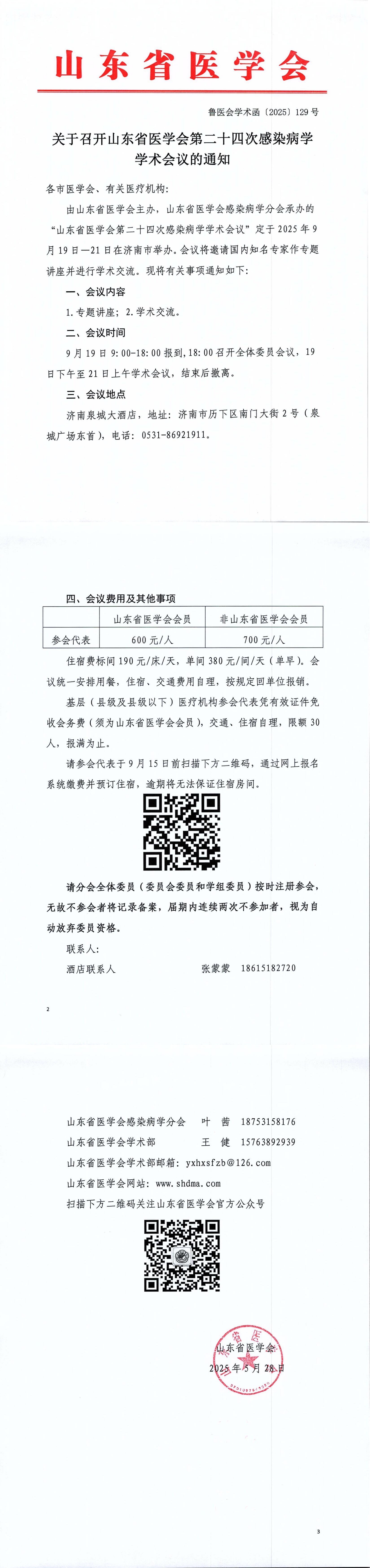 关于召开山东省医学会第二十四次感染病学学术会议的通知