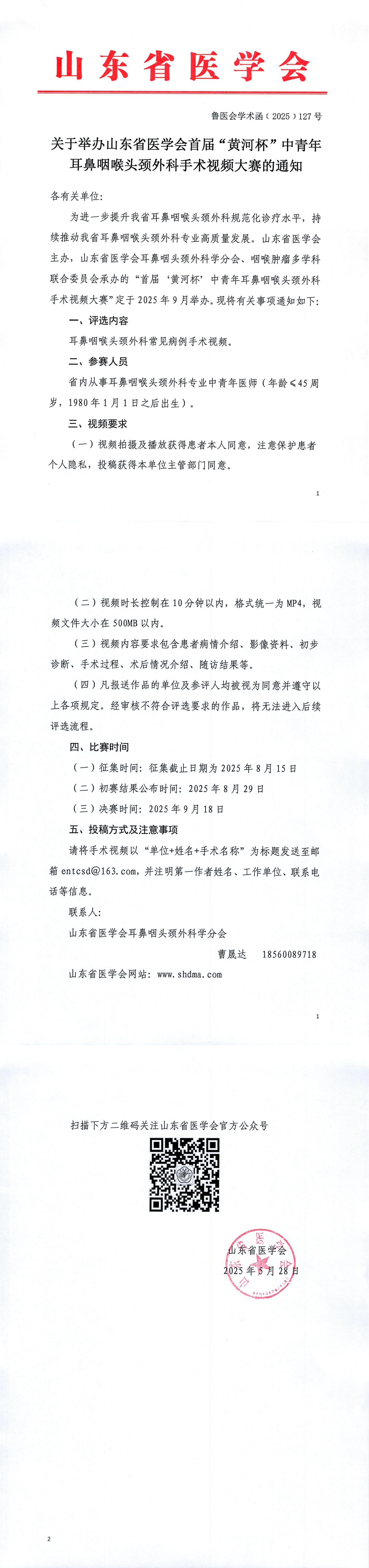 关于举办山东省医学会首届“黄河杯”中青年耳鼻咽喉头颈外科手术视频大赛的通知