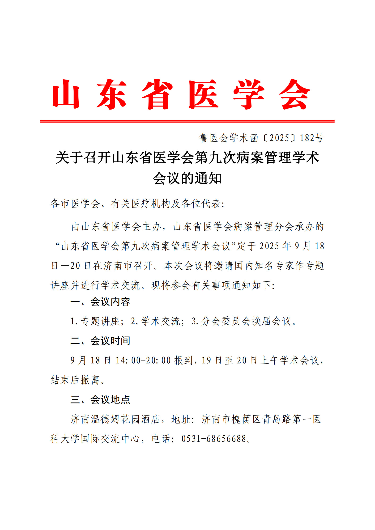 关于召开山东省医学会第九次病案管理学术会议的通知