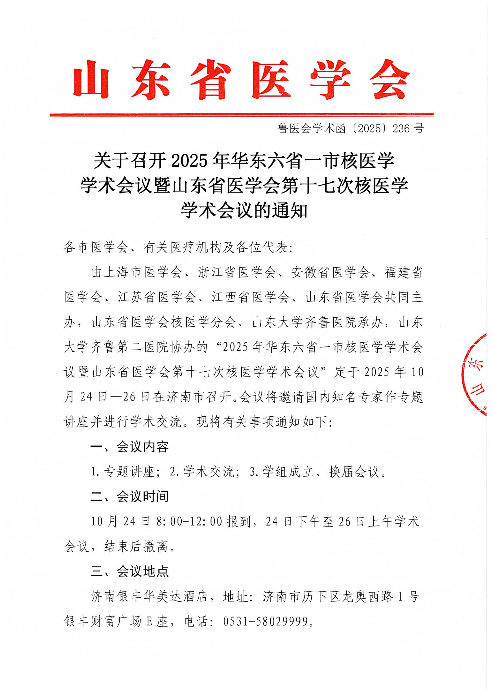 关于召开2025年华东六省一市核医学学术会议暨山东省医学会第十七次核医学学术会议的通知