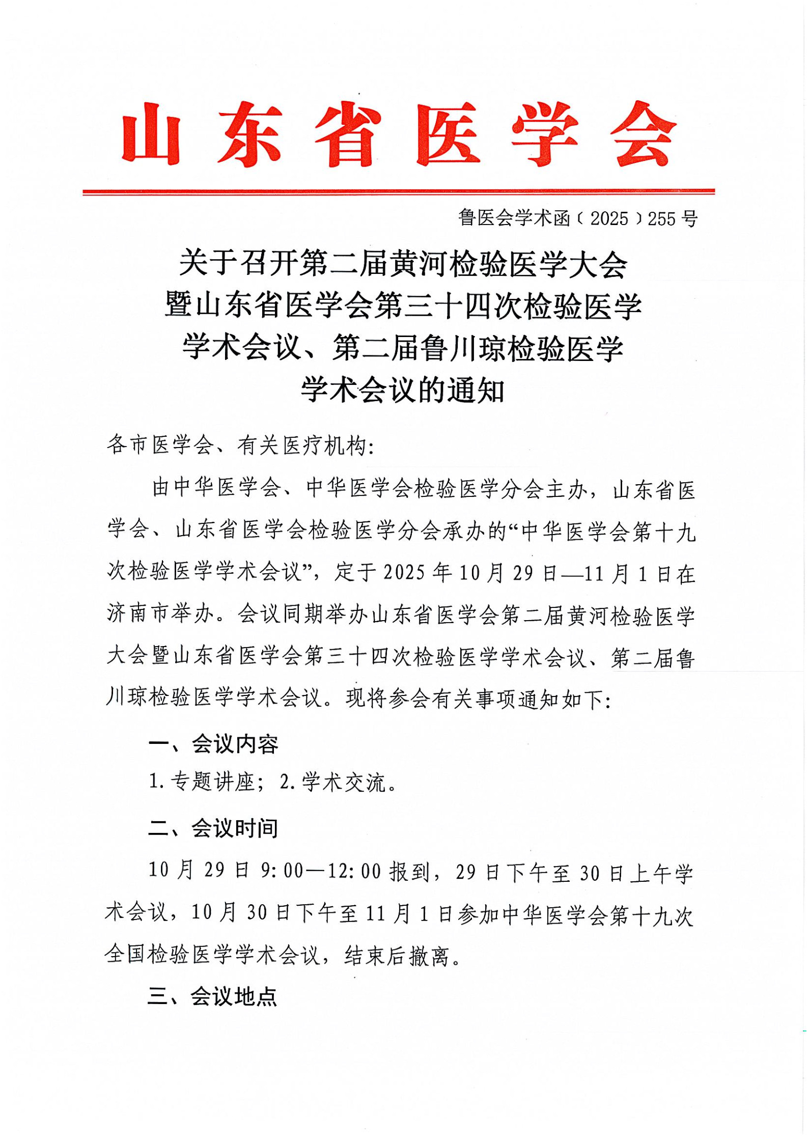 关于召开第二届黄河检验医学大会暨山东省医学会第三十四次检验医学学术会议、第二届鲁川琼检验医学学术会议