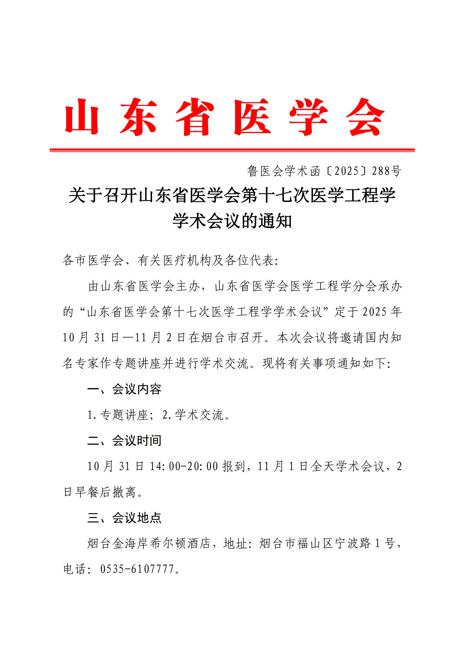 关于召开山东省医学会第十七次医学工程学学术会议的通知