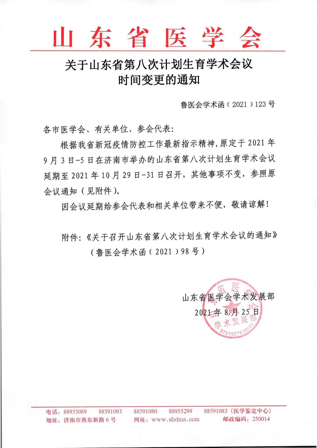 关于山东省第八次计划生育学术会议时间变更的通知