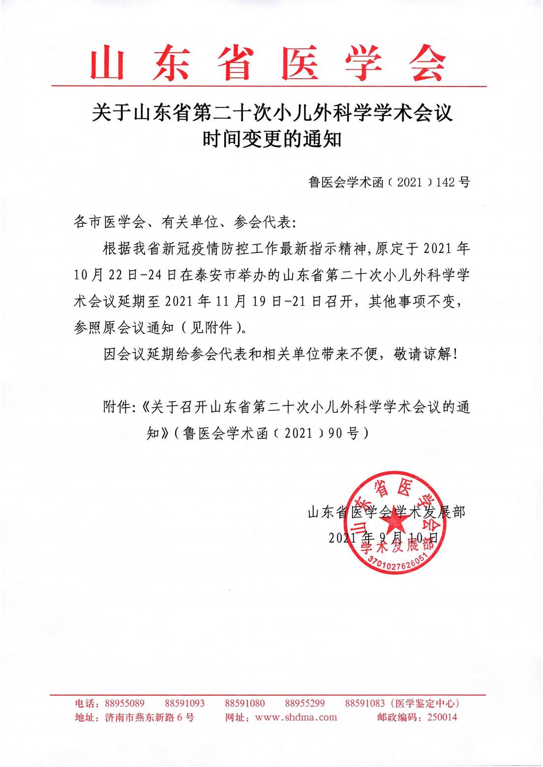 关于山东省第二十次小儿外科学学术会议时间变更的通知_