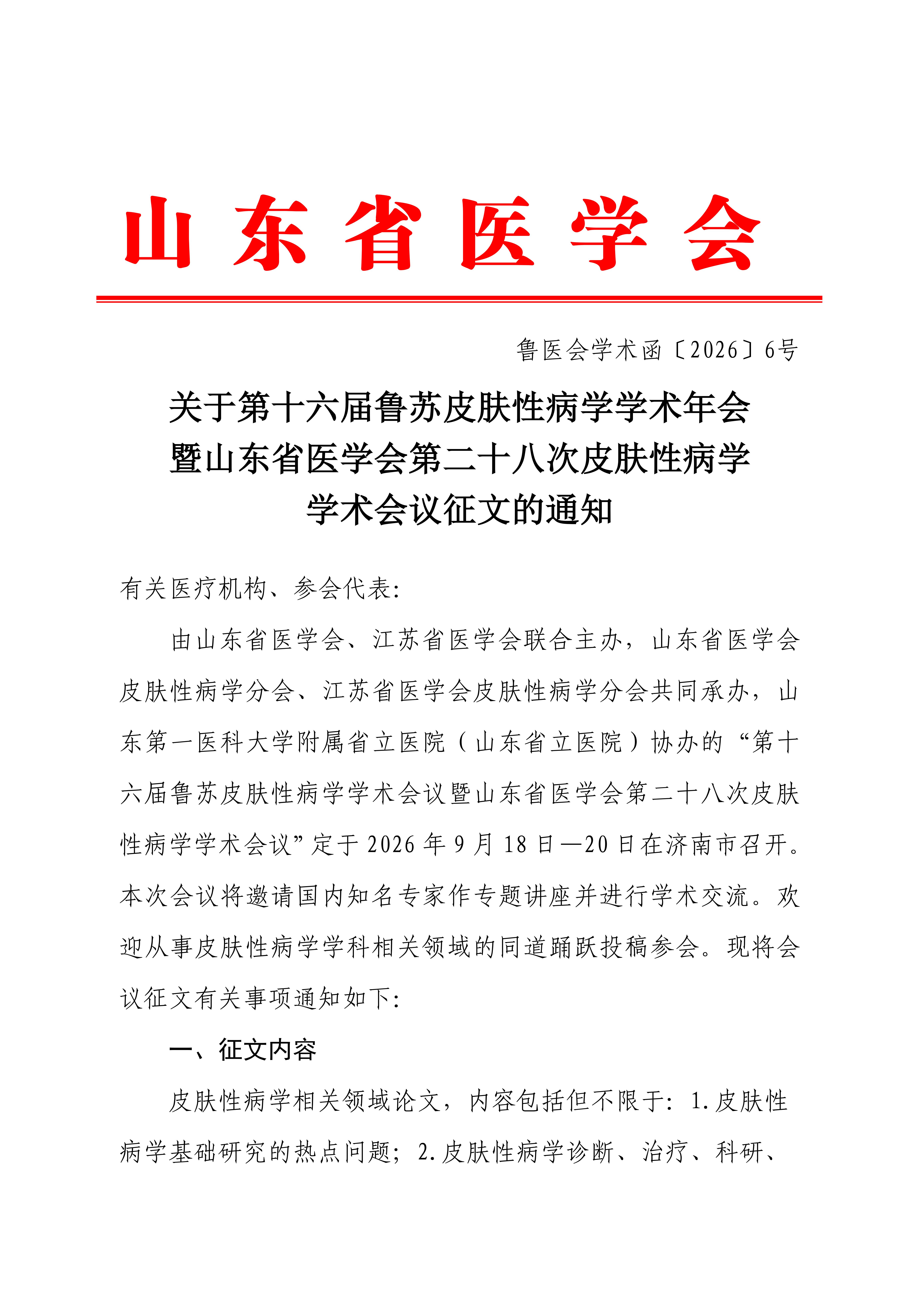 关于第十六届鲁苏皮肤性病学学术年会暨山东省医学会第二十八次皮肤性病学学术会议征文的通知