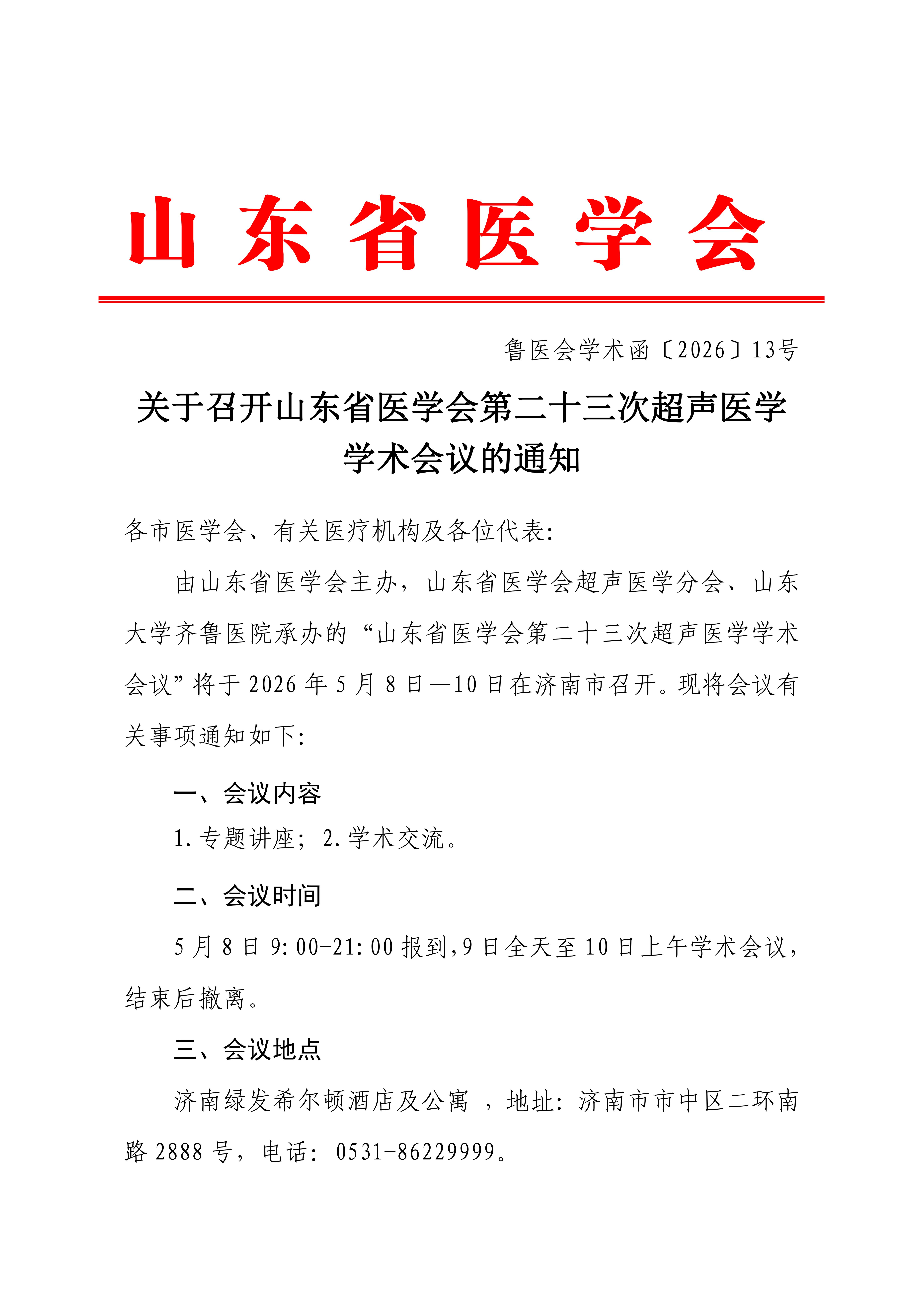 关于召开山东省医学会第二十三次超声医学学术会议的通知