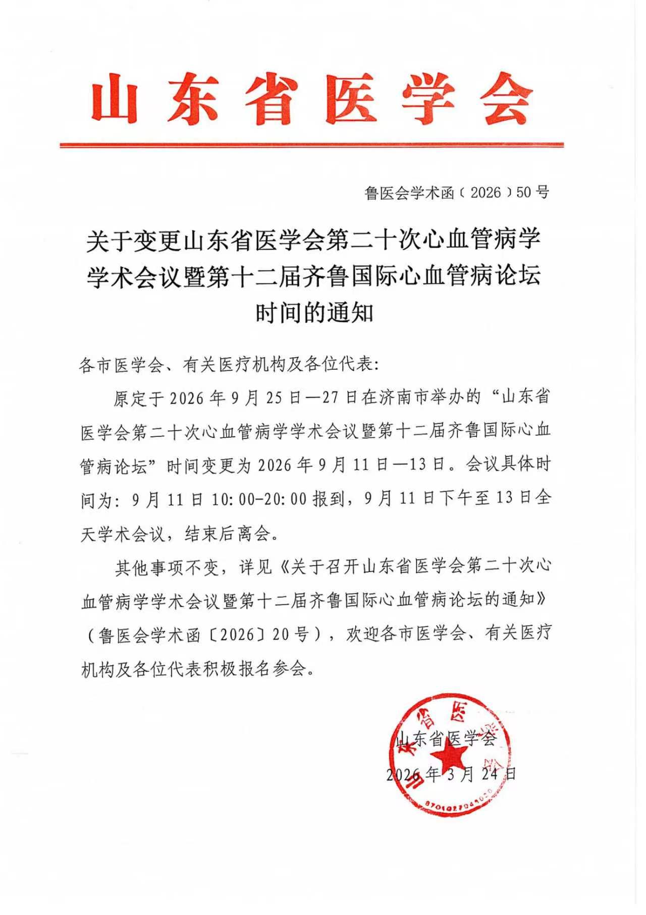 关于变更山东省医学会第二十次心血管病学学术会议暨第十二届齐鲁国际心血管病论坛时间的通知