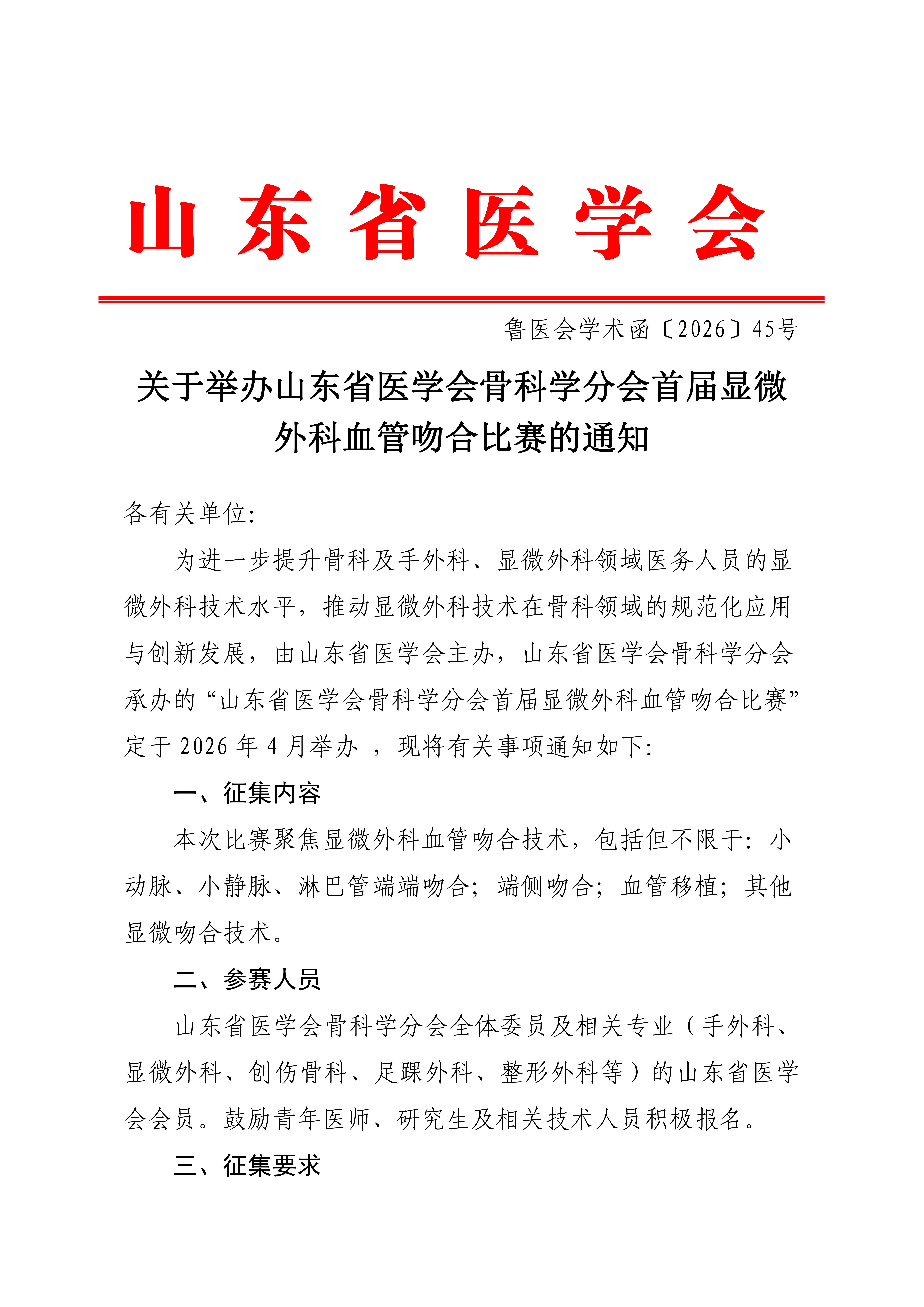 关于举办山东省医学会骨科学分会首届显微外科血管吻合比赛的通知