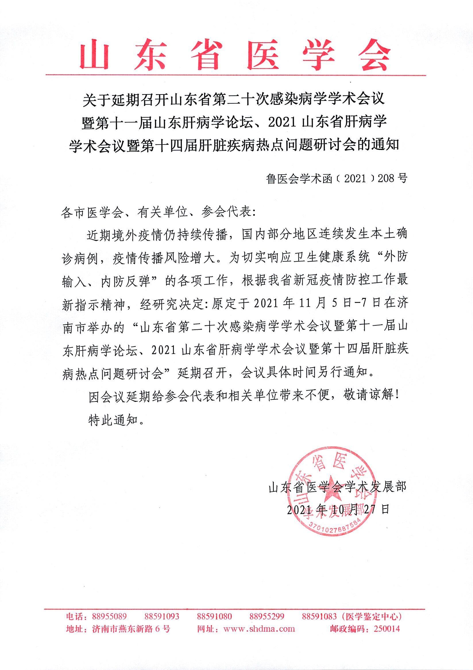关于延期召开山东省第二十次感染病学学术会议暨第十一届山东肝病学论坛、2021 山东省肝病学学术会议暨第十四届肝脏疾病热点问题研讨会的通知