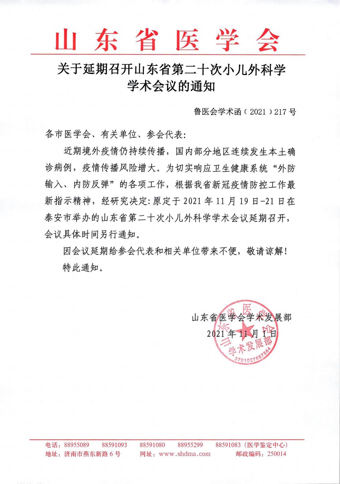 关于延期召开山东省第二十次小儿外科学学术会议的通知