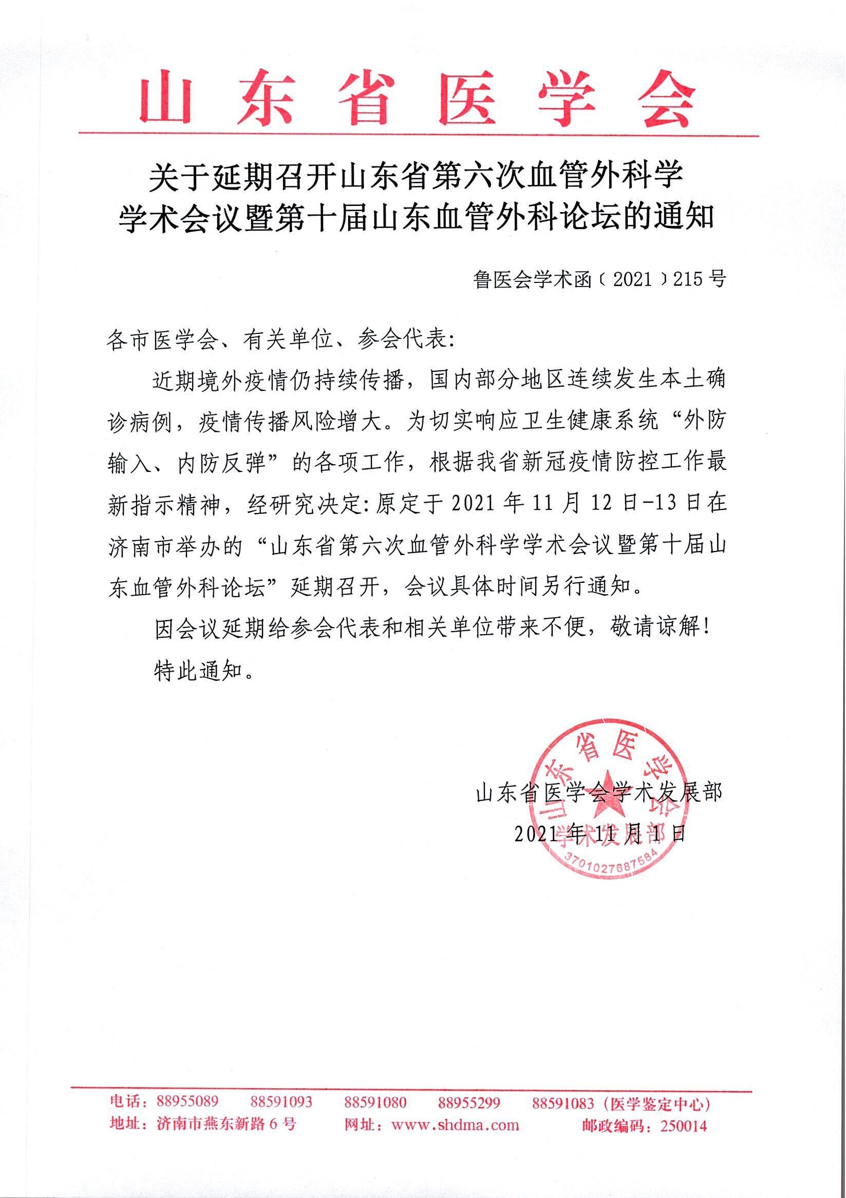 关于延期召开山东省第六次血管外科学学术会议暨第十届山东血管外科论坛的通知