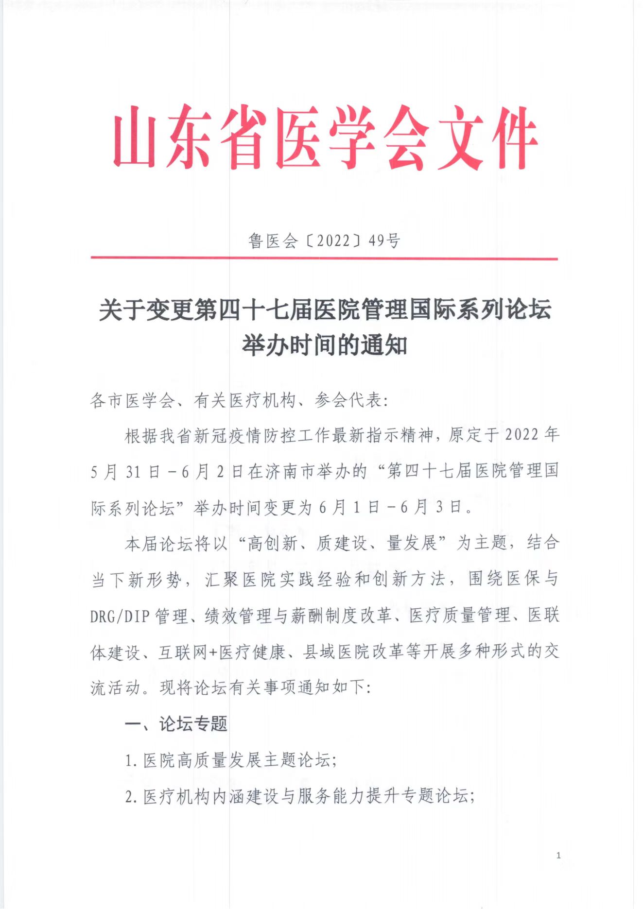 关于变更第四十七届医院管理国际系列论坛举办时间的通知