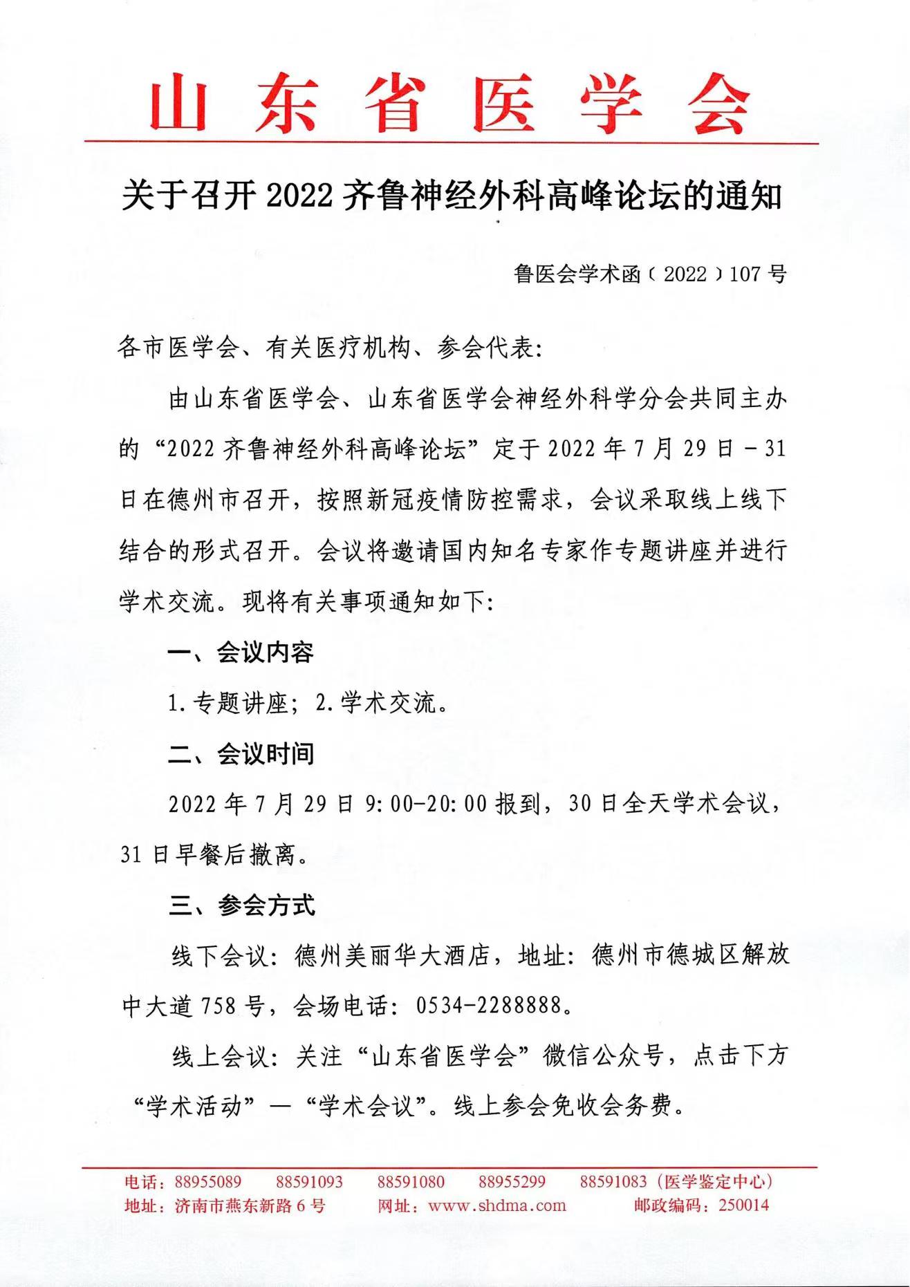关于召开2022齐鲁神经外科高峰论坛的通知