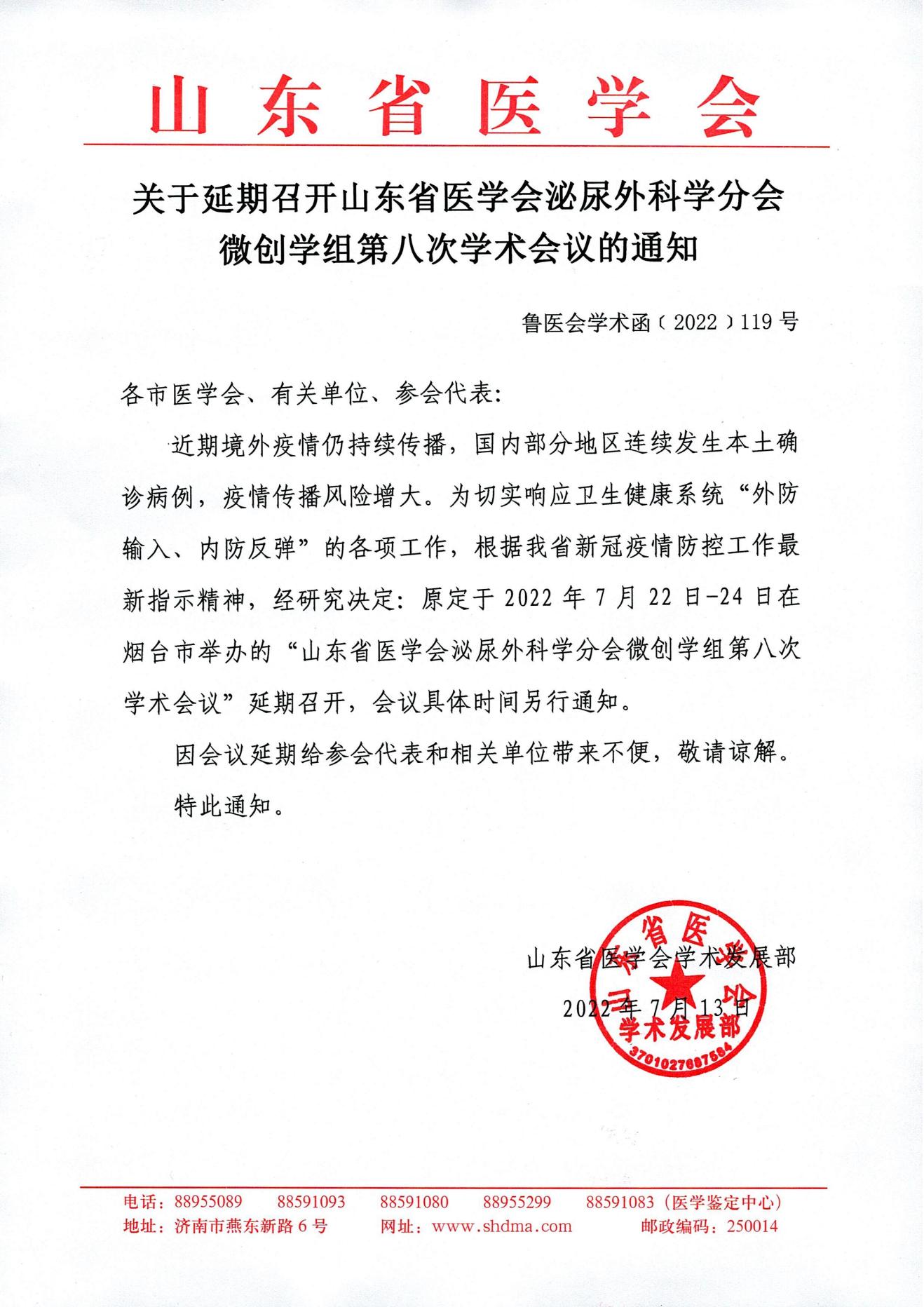 关于延期召开山东省医学会泌尿外科学分会微创学组第八次学术会议的通知