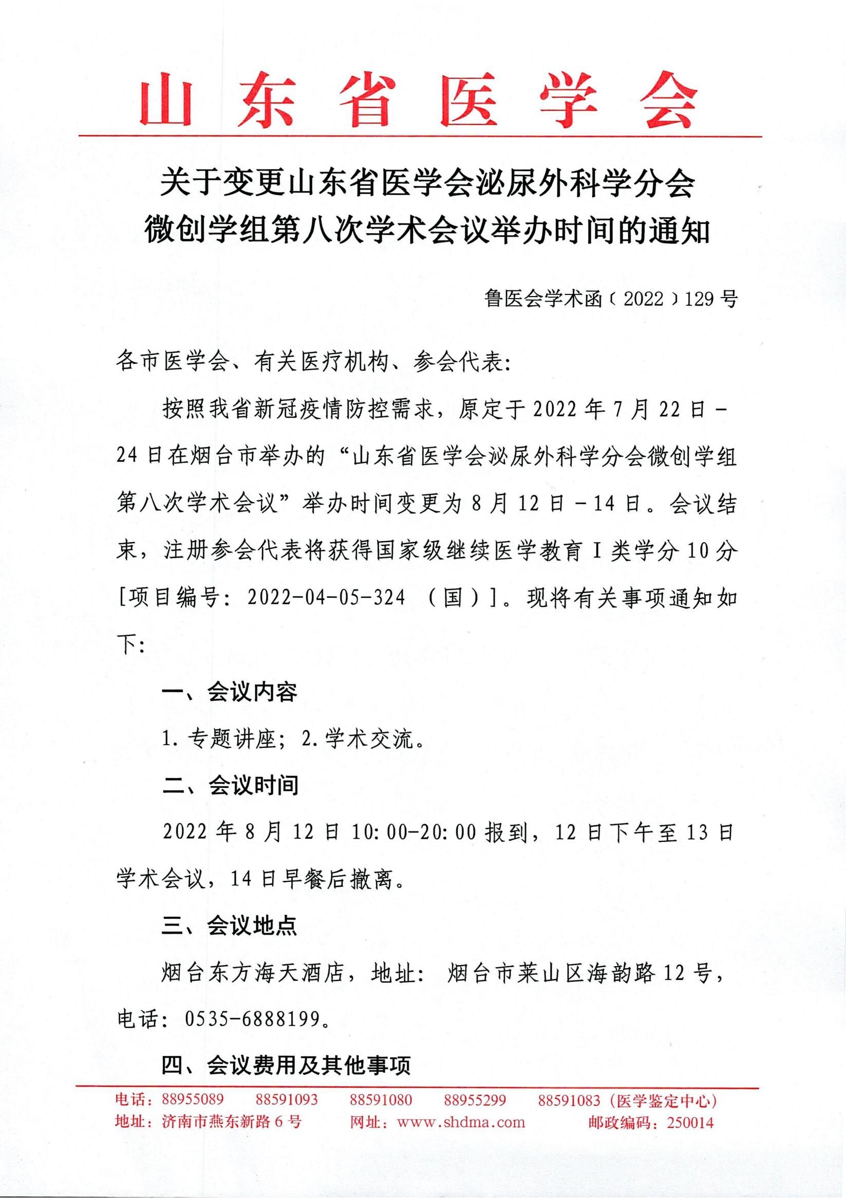 关于变更山东省医学会泌尿外科学分会微创学组第八次学术会议举办时间的通知
