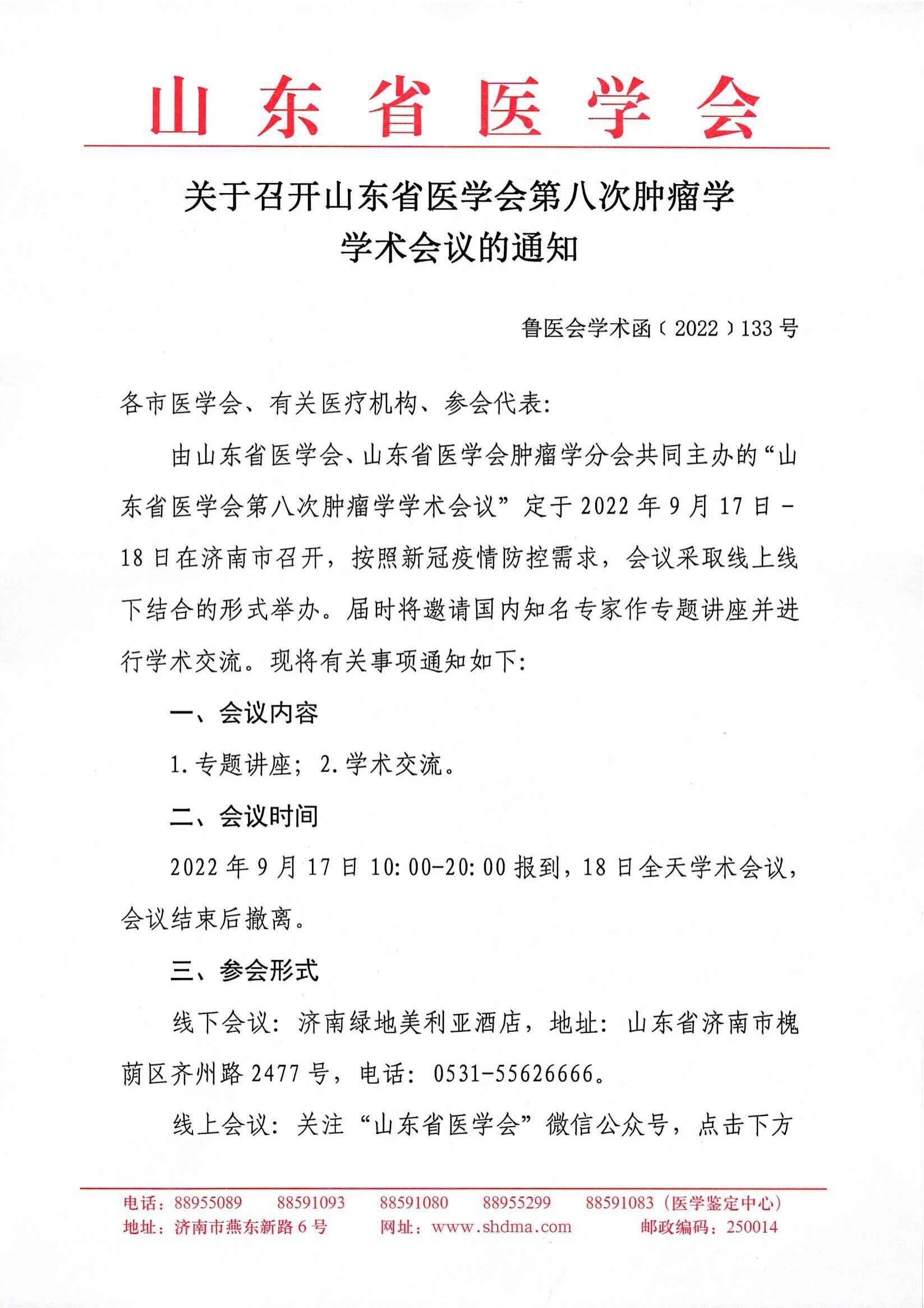 关于召开山东省医学会第八次肿瘤学学术会议的通知