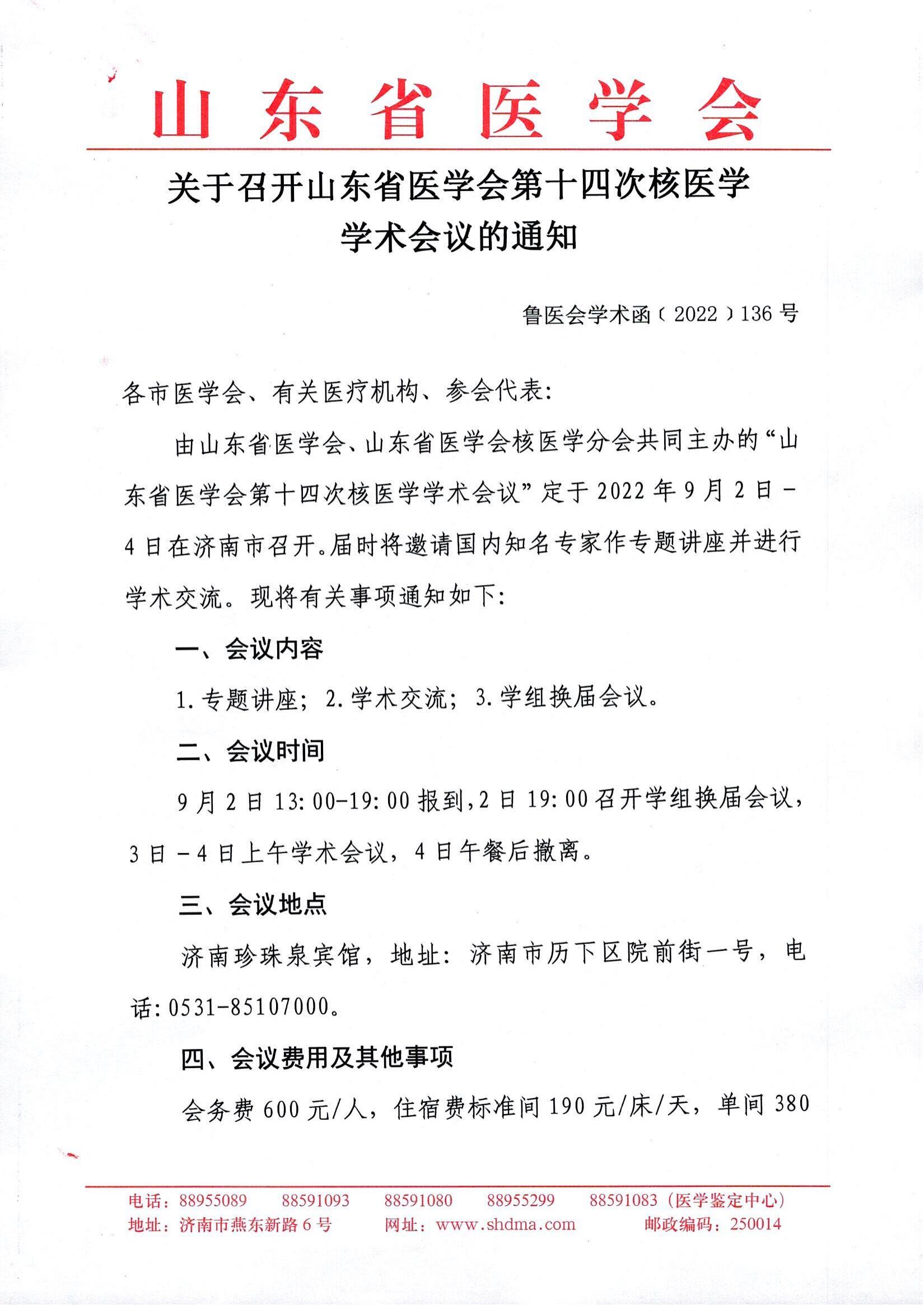 关于召开山东省医学会第十四次核医学学术会议的通知