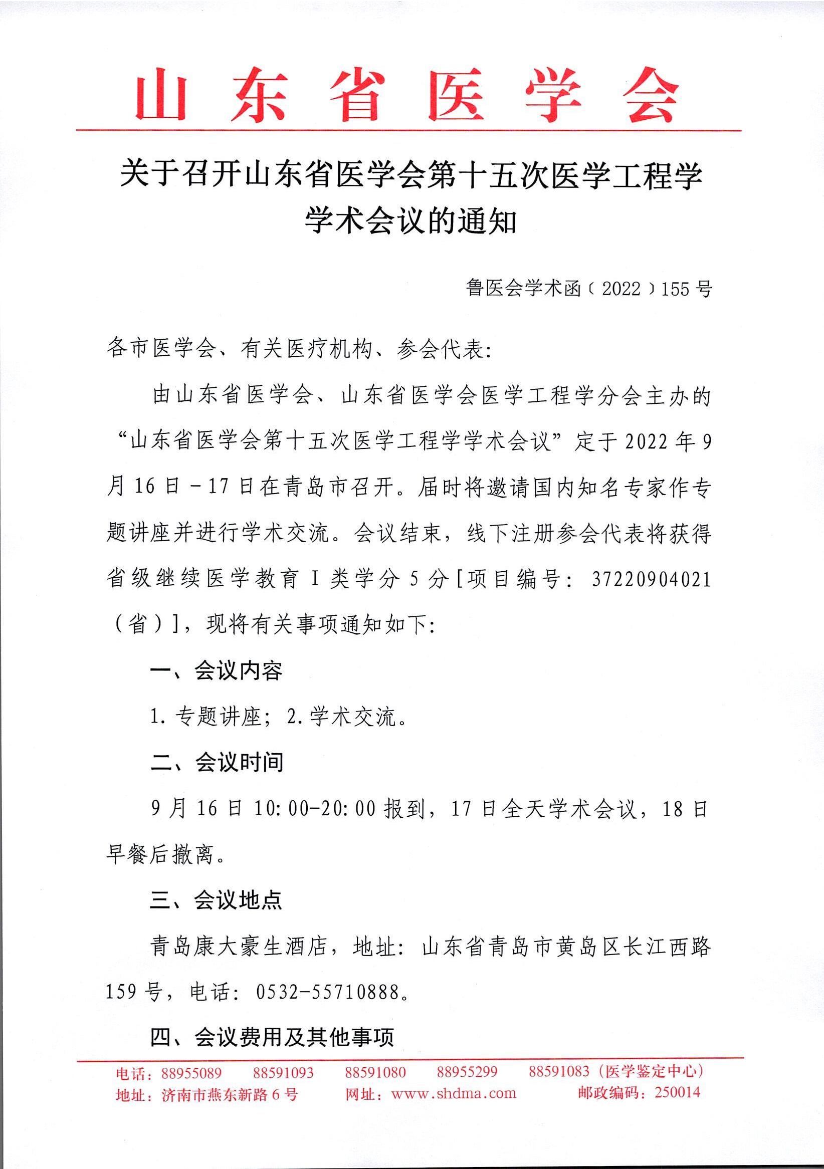 关于召开山东省医学会第十五次医学工程学学术会议的通知