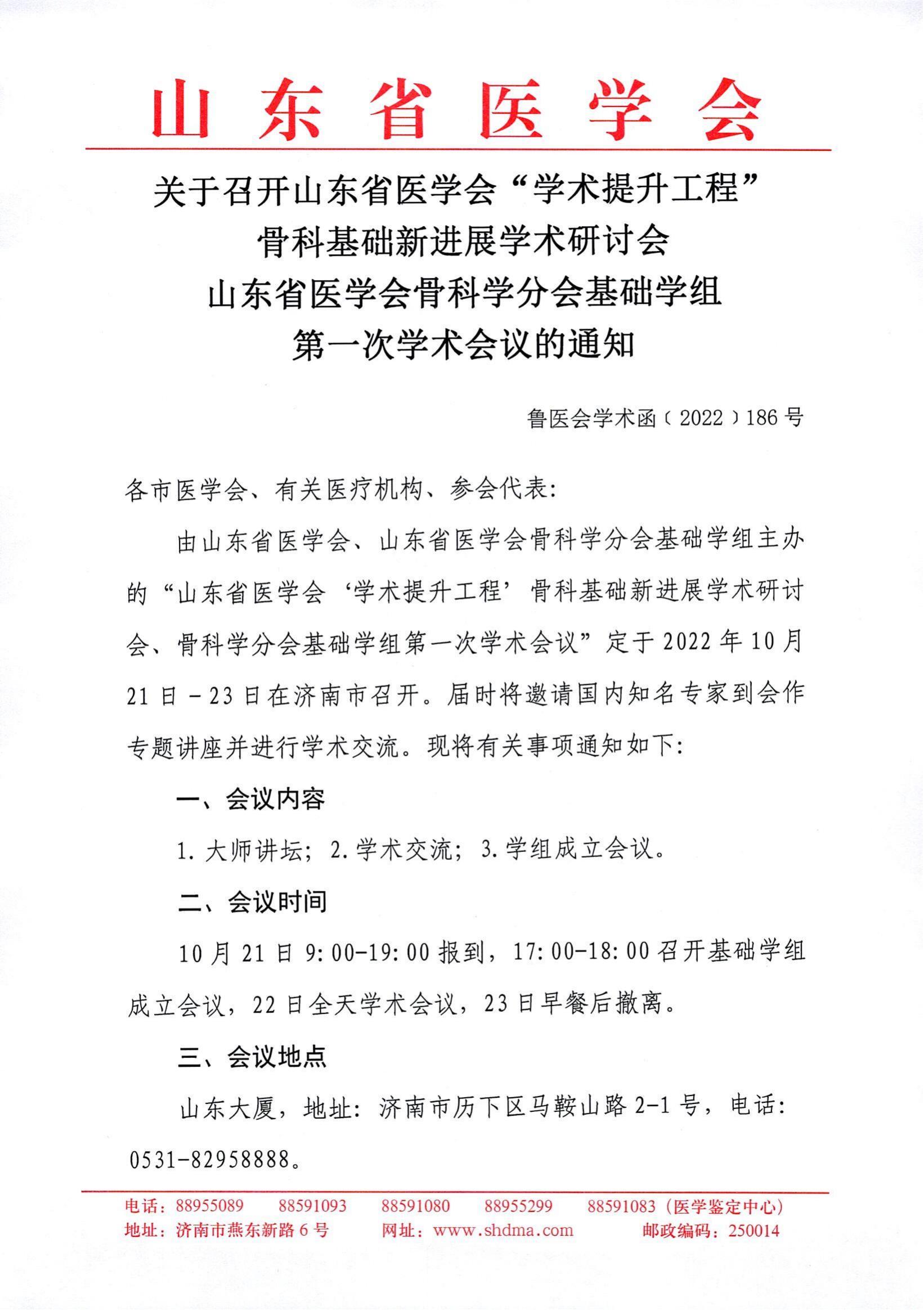 关于召开山东省医学会“学术提升工程”骨科基础新进展学术研讨会、山东省医学会骨科学分会基础学组第一次学术会议的通知