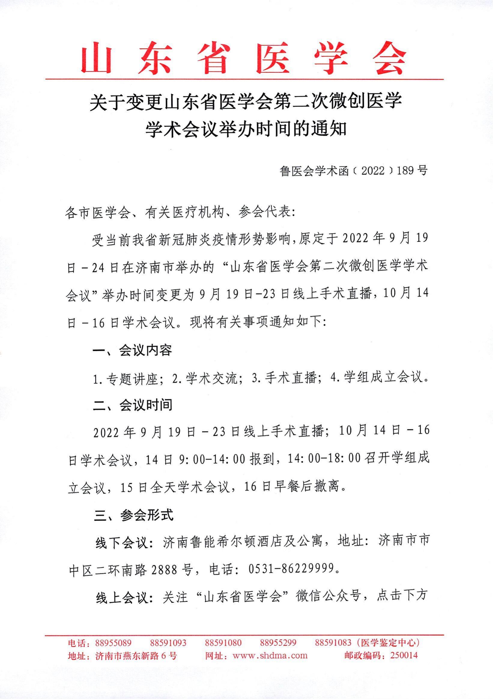 关于变更山东省医学会第二次微创医学学术会议举办时间的通知