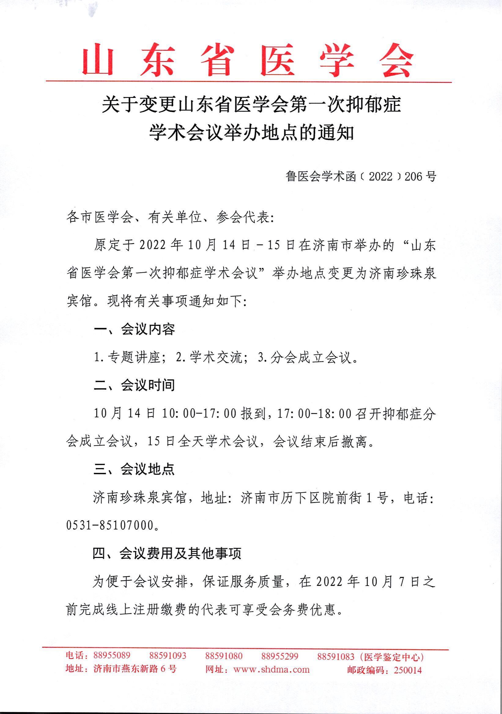 关于变更山东省医学会第一次抑郁症学术会议举办地点的通知