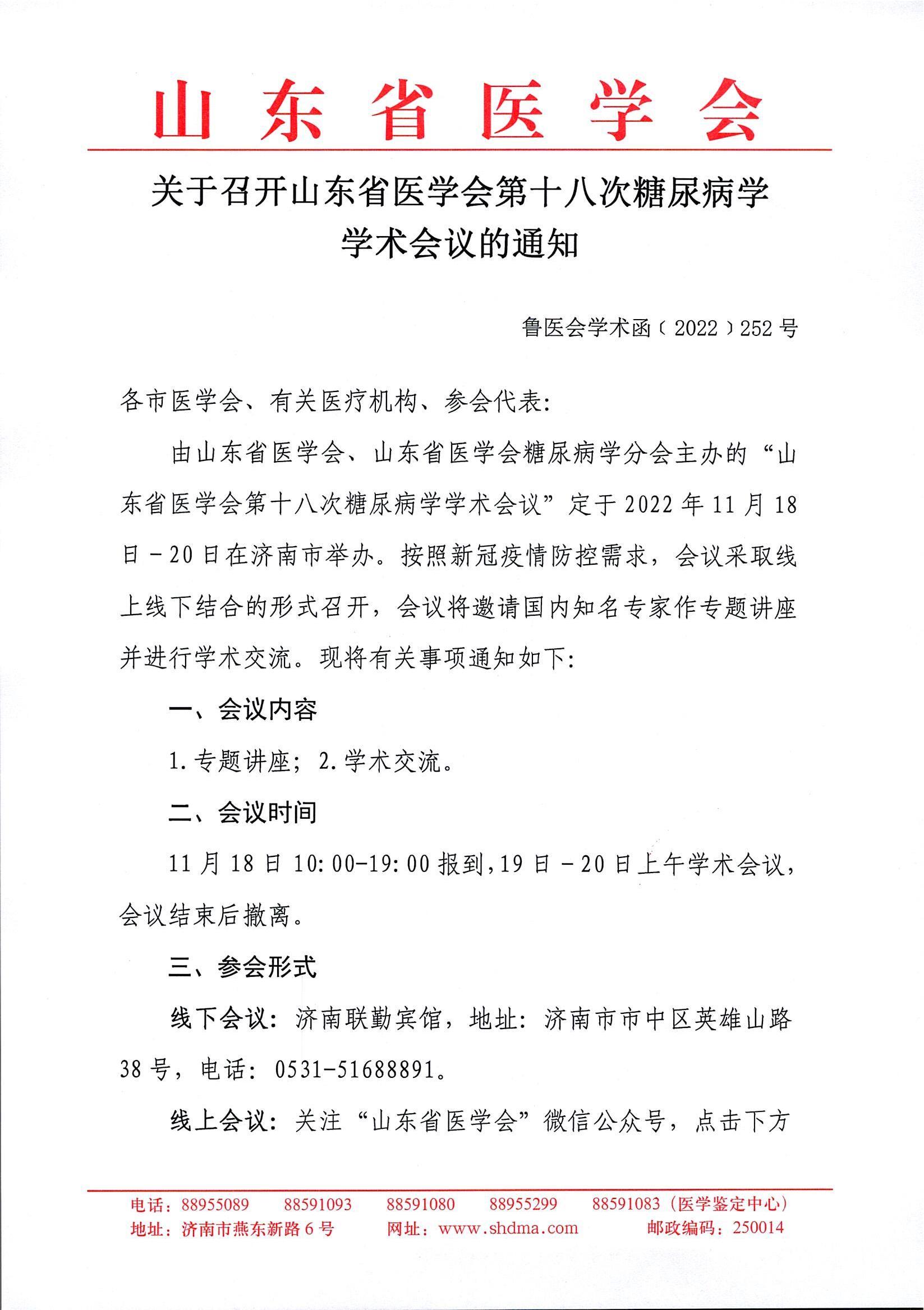 关于召开山东省医学会第十八次糖尿病学学术会议的通知