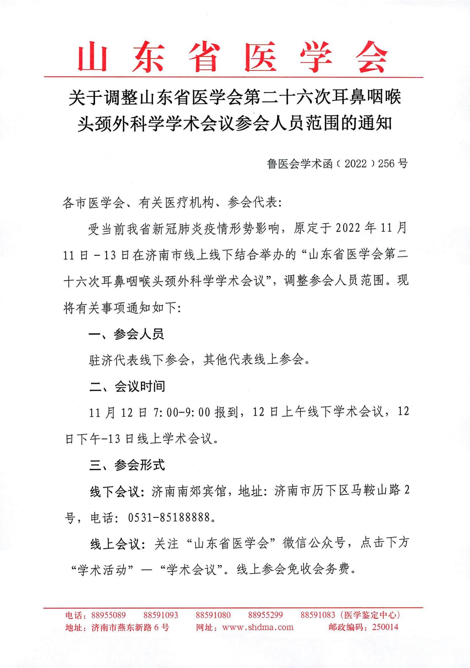 关于调整山东省医学会第二十六次耳鼻咽喉头颈外科学学术会议参会人员范围的通知