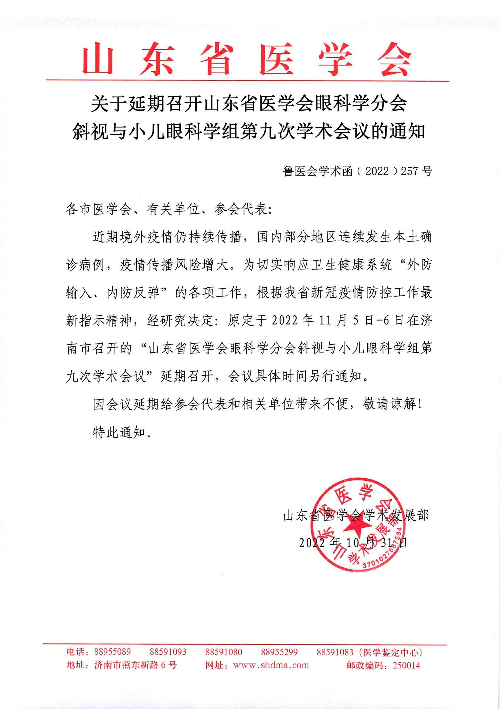 关于延期召开山东省医学会眼科学分会斜视与小儿眼科学组第九次学术会议的通知
