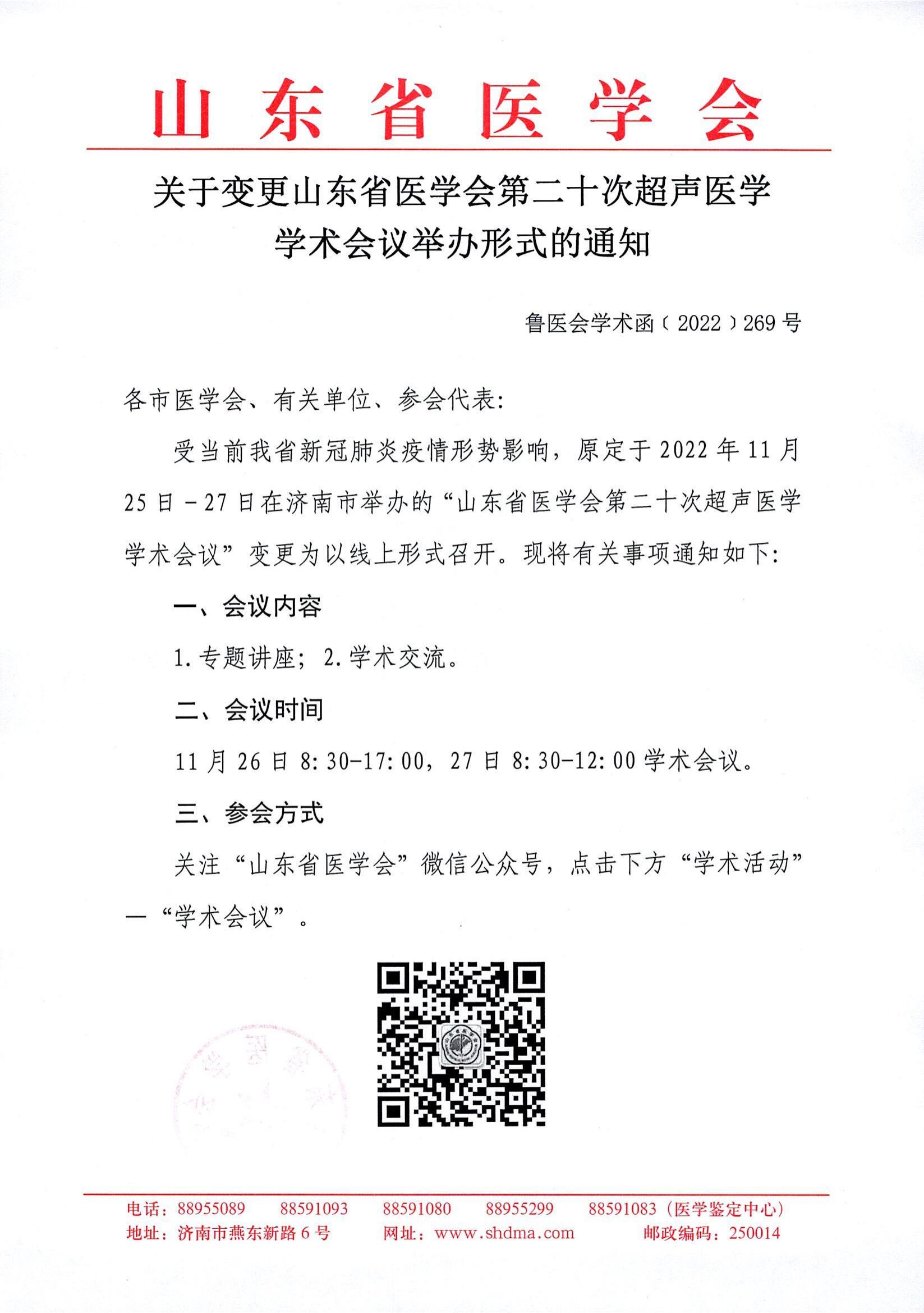 关于变更山东省医学会第二十次超声医学学术会议举办形式的通知