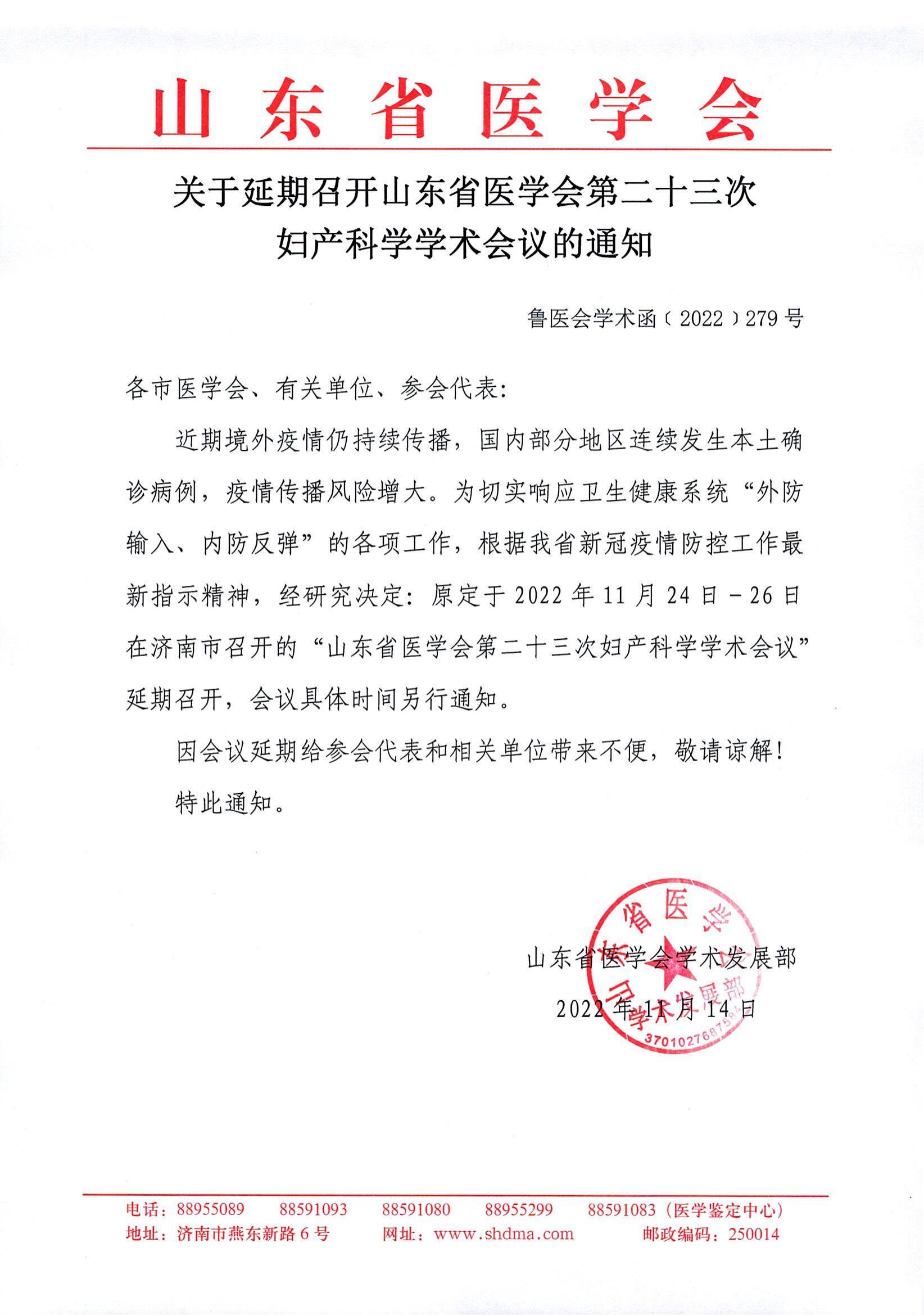 关于延期召开山东省医学会第二十三次妇产科学学术会议的通知